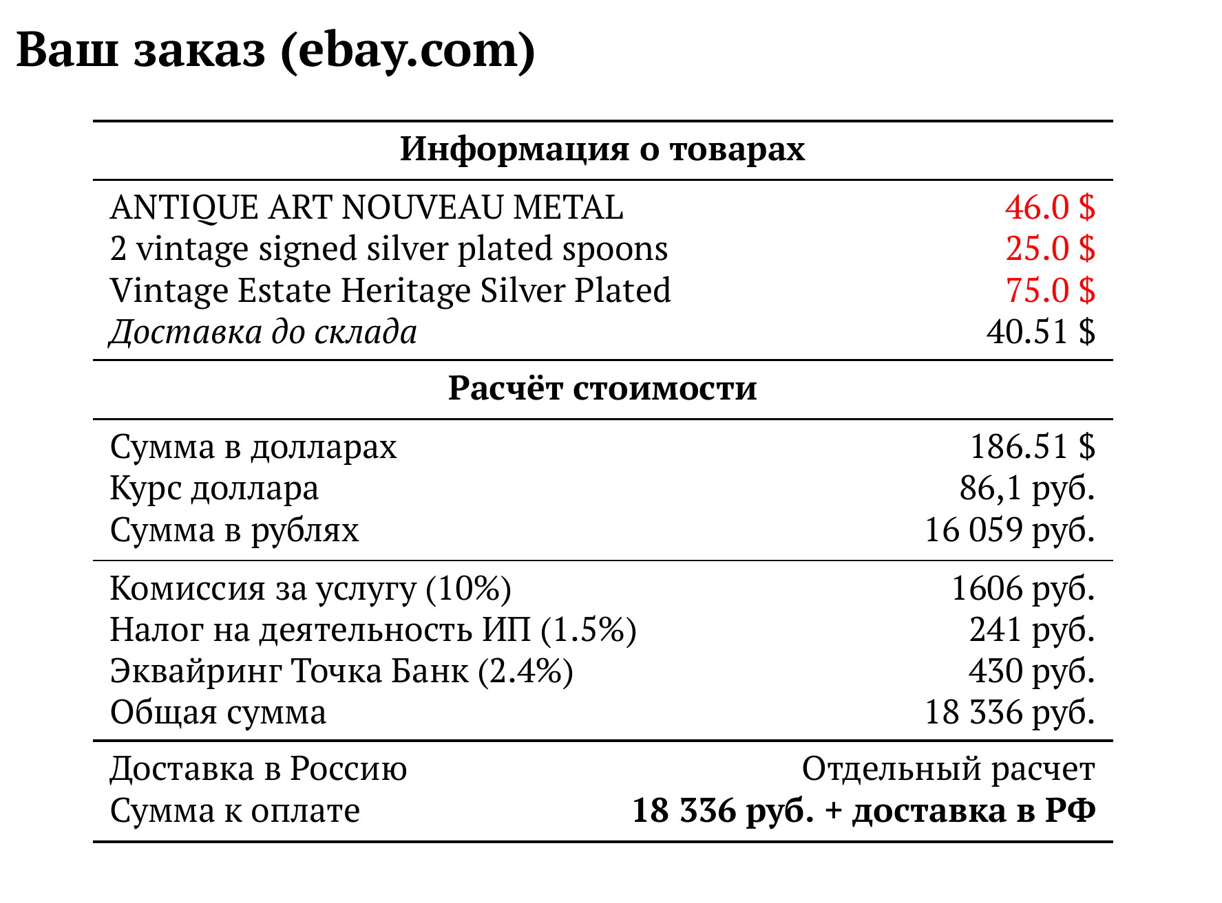 Расчет для ebay.com — 18 336 руб.