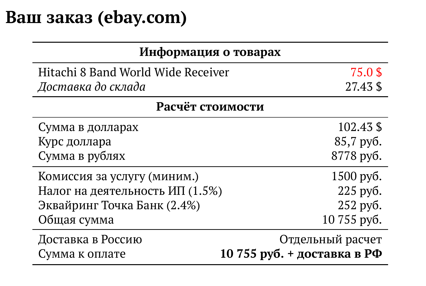 Расчет для ebay.com — 10 755 руб.
