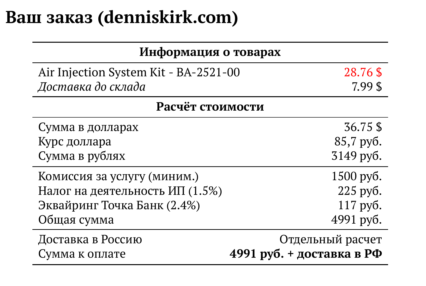 Расчет для denniskirk.com — 4991 руб.