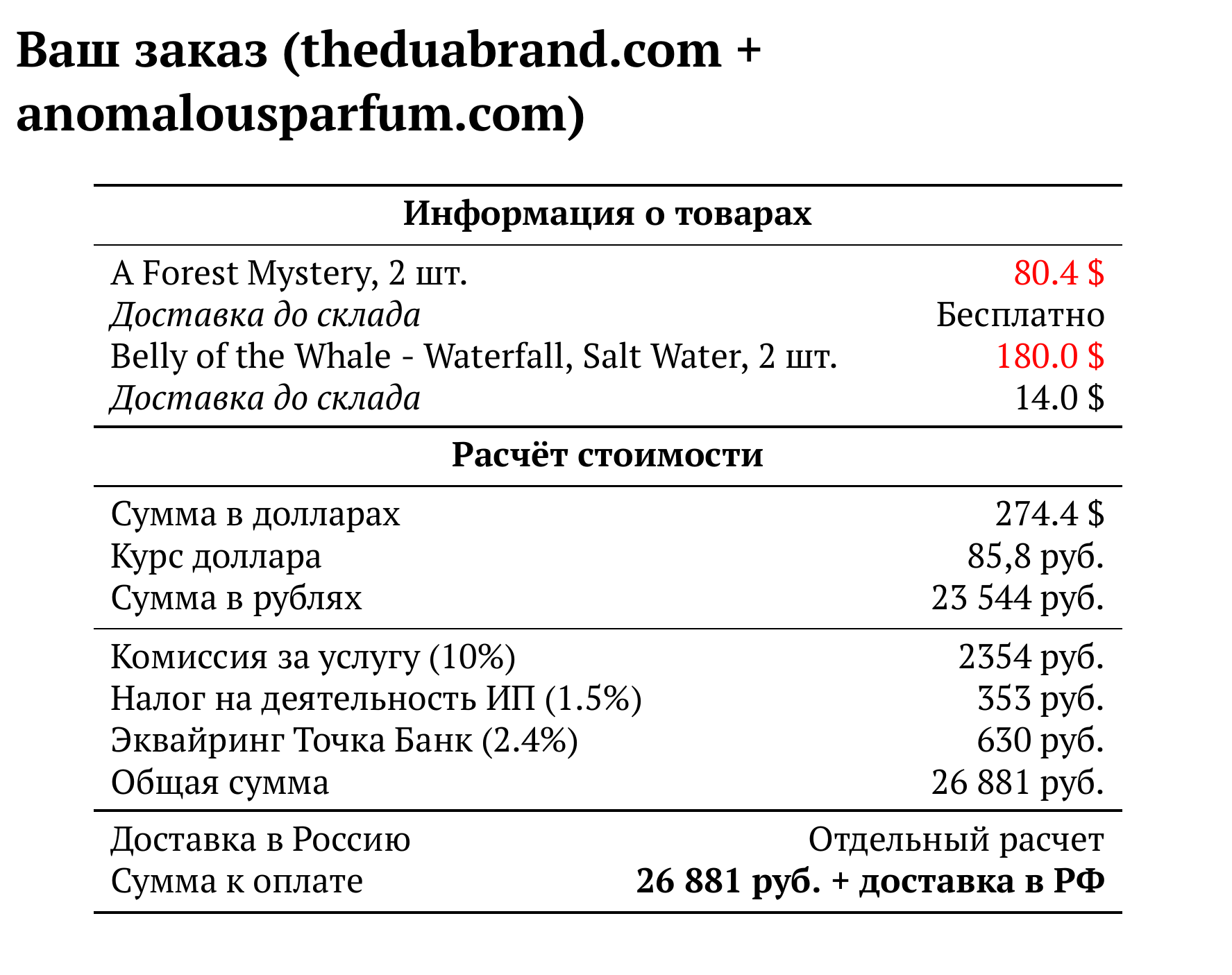 Расчет для theduabrand.com + anomalousparfum.com — 26 881 руб.