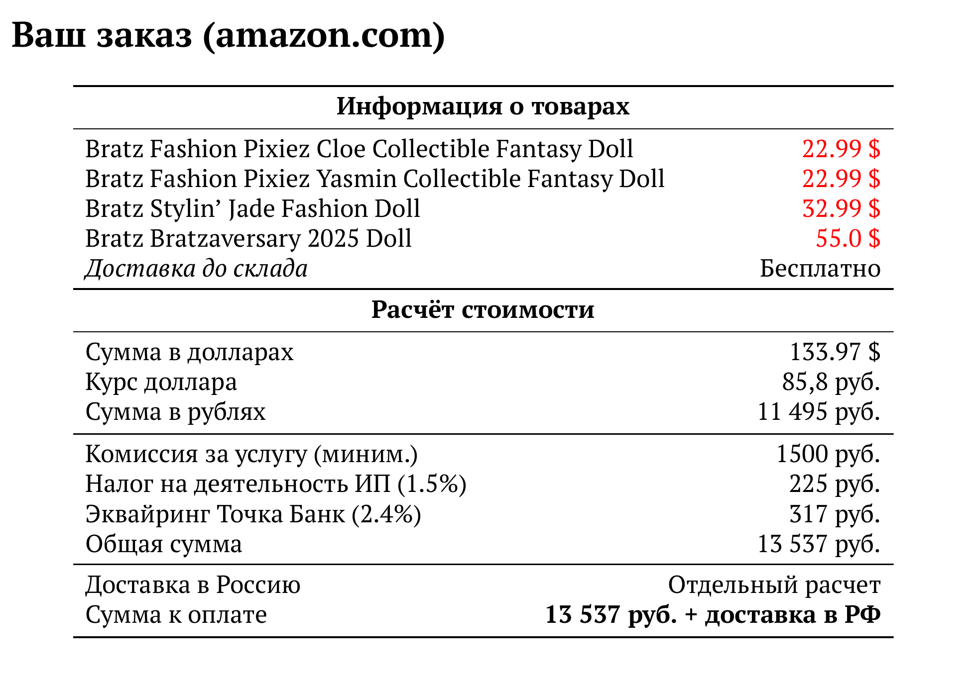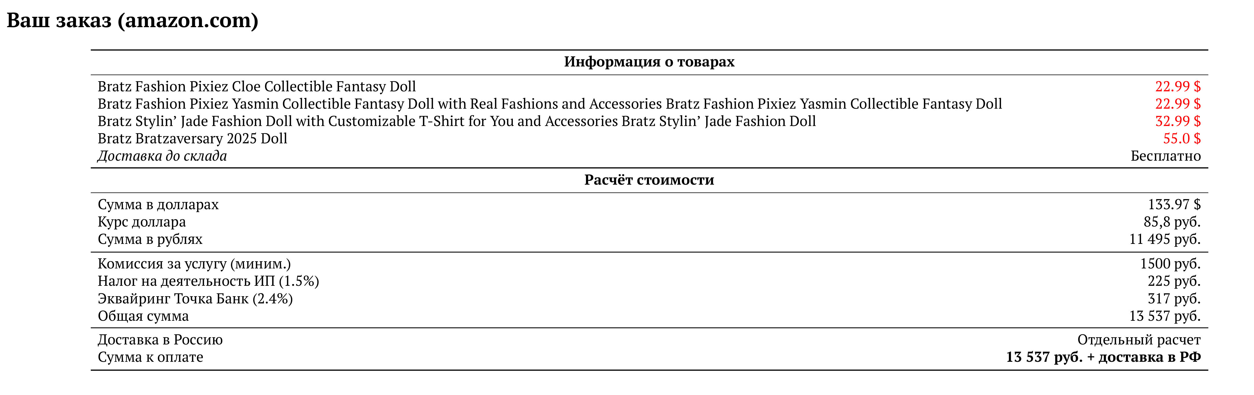 Расчет для amazon.com — 13 537 руб.