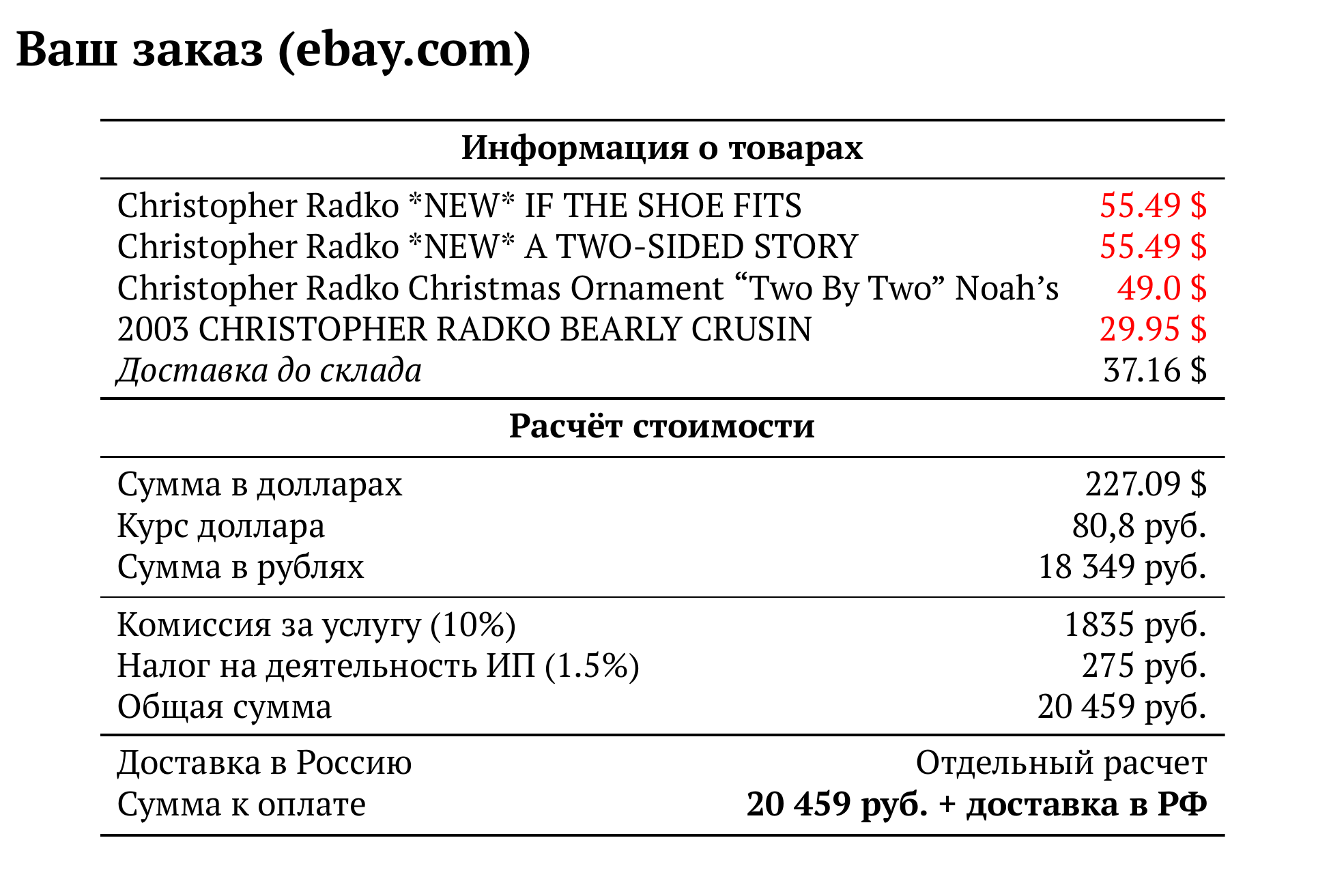 Расчет для ebay.com — 20 459 руб.