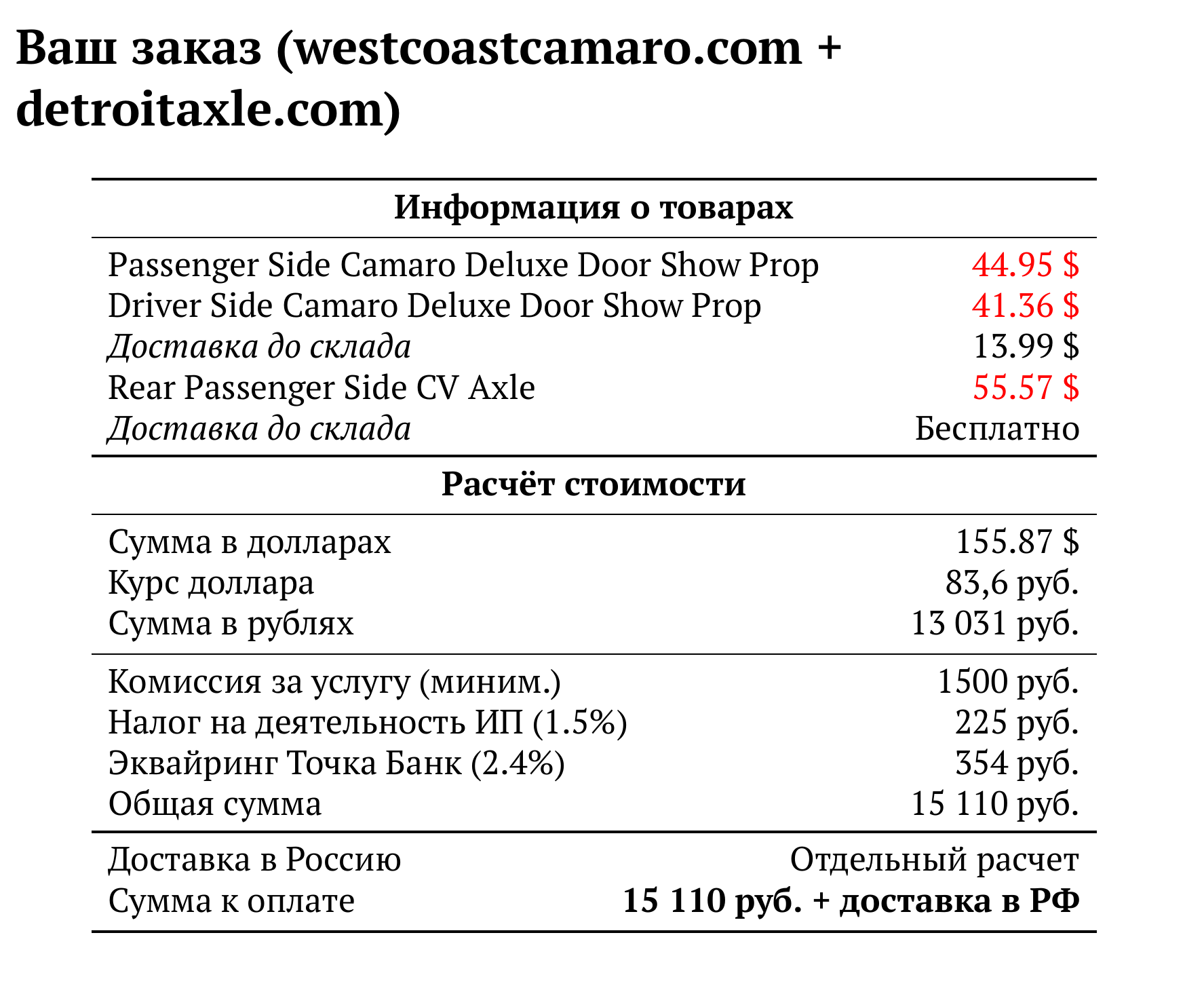 Расчет для westcoastcamaro.com + detroitaxle.com — 15 110 руб.
