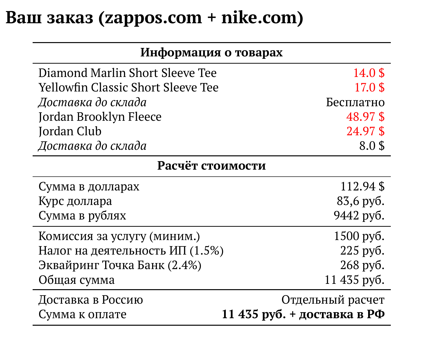 Расчет для zappos.com + nike.com — 11 435 руб.