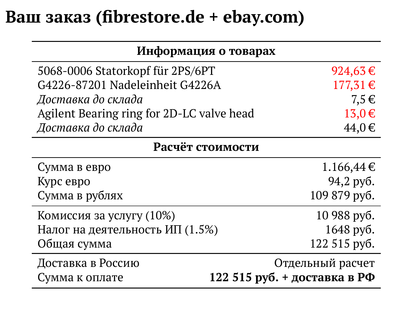 Расчет для fibrestore.de + ebay.com — 122 515 руб.