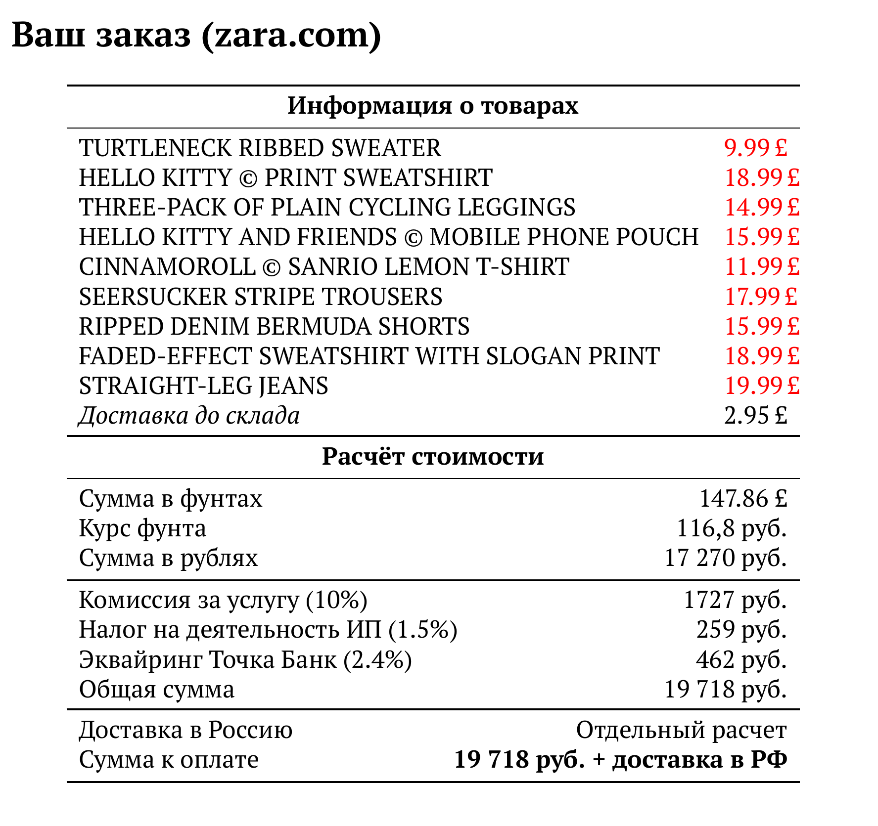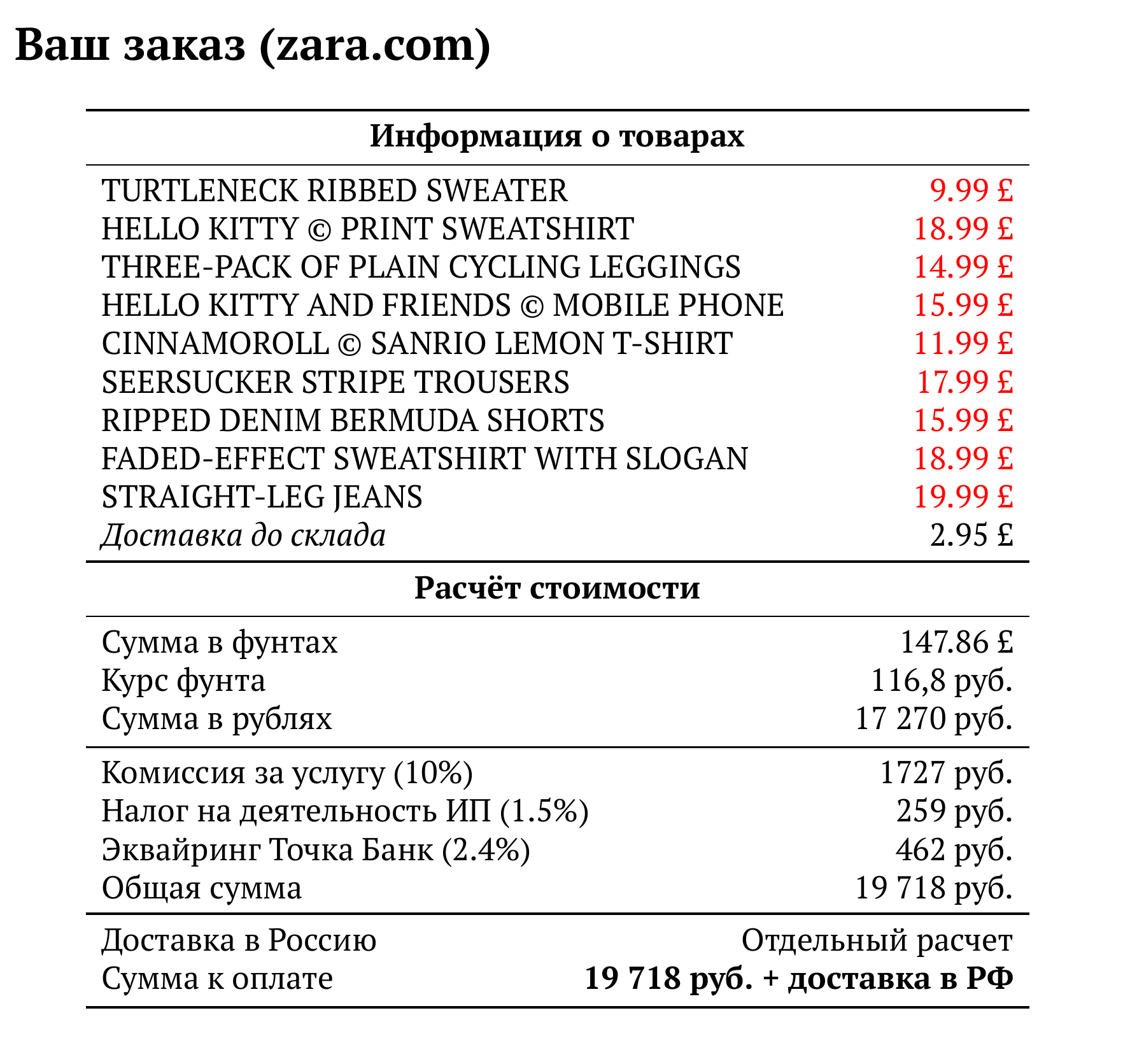 Расчет для zara.com — 19 718 руб.