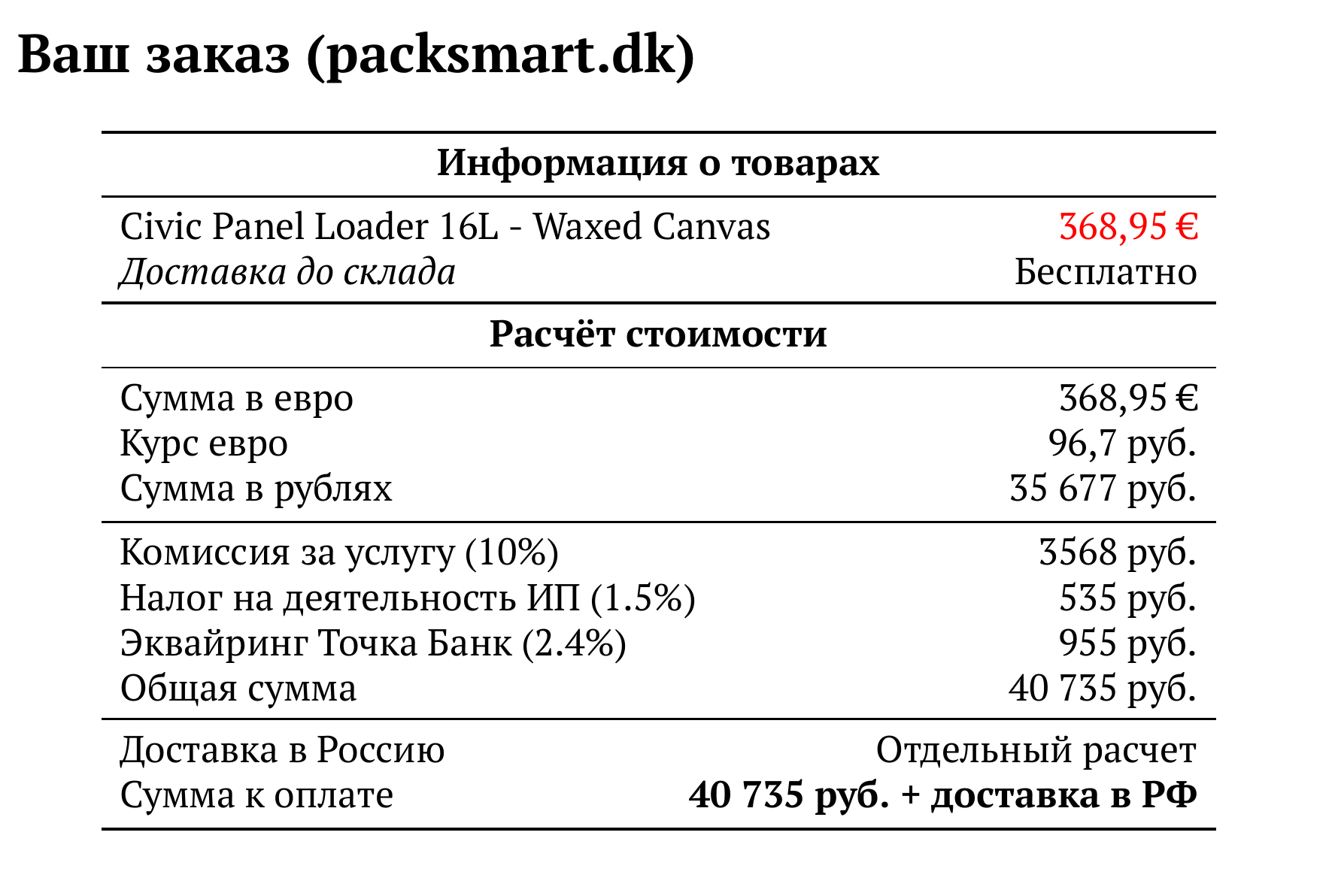 Расчет для packsmart.dk — 40 735 руб.