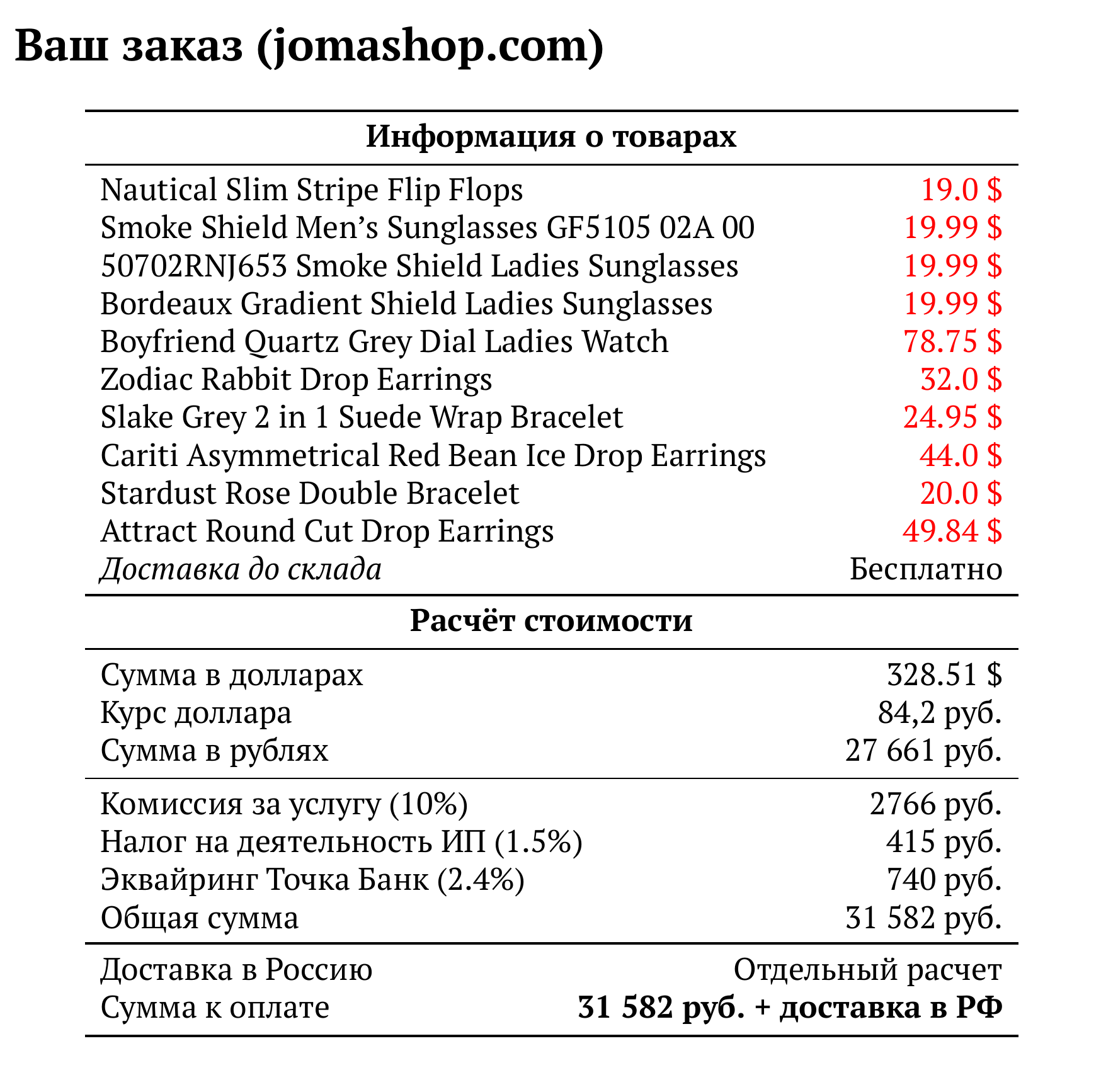 Расчет для jomashop.com — 31 582 руб.