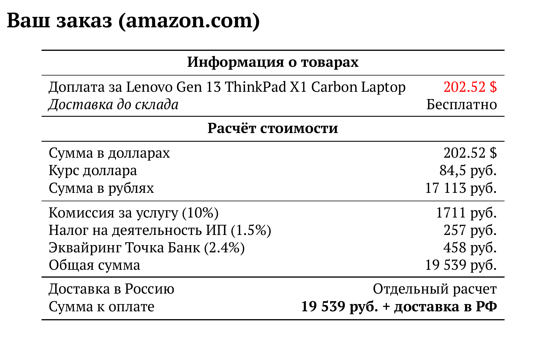 Расчет для amazon.com — 19 539 руб.