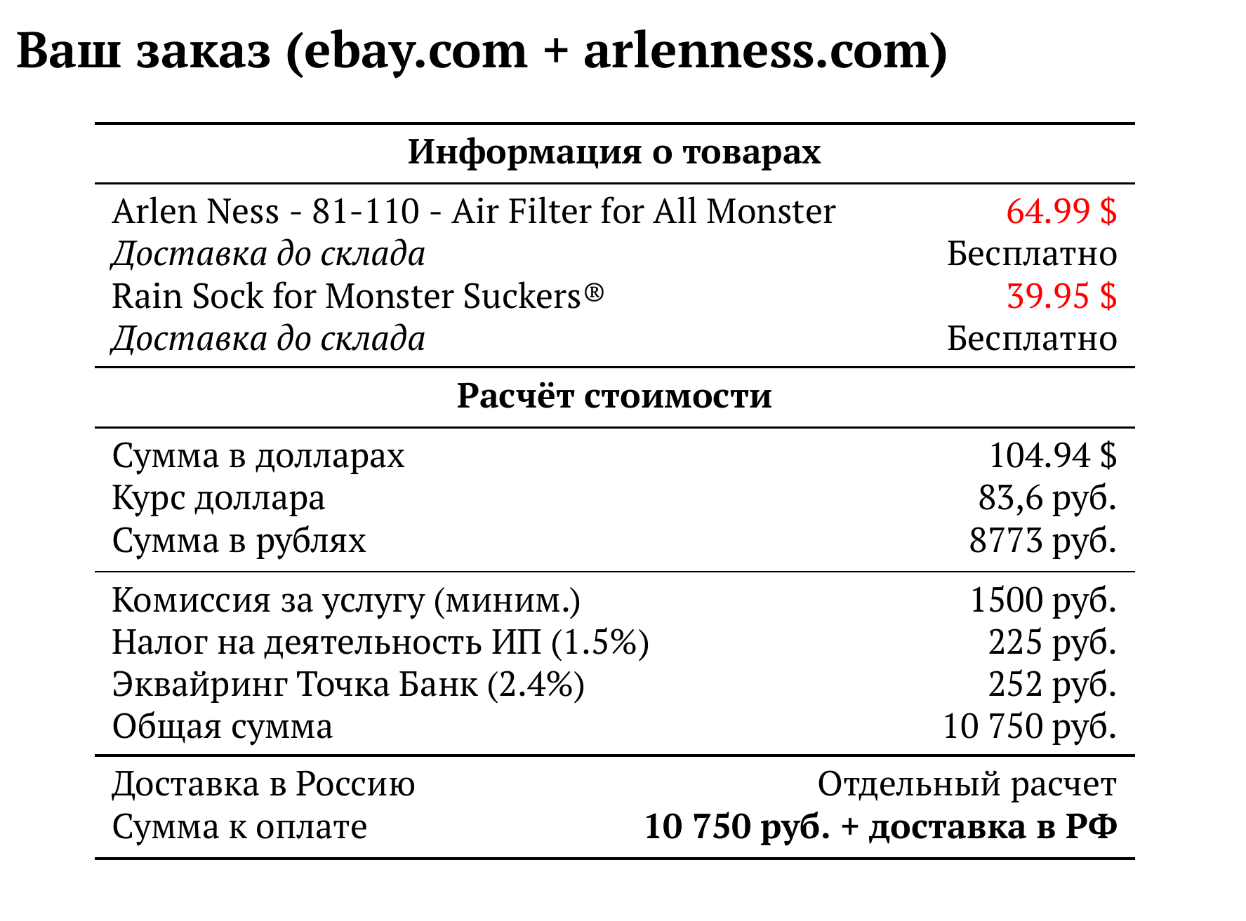 Расчет для ebay.com + arlenness.com — 10 750 руб.