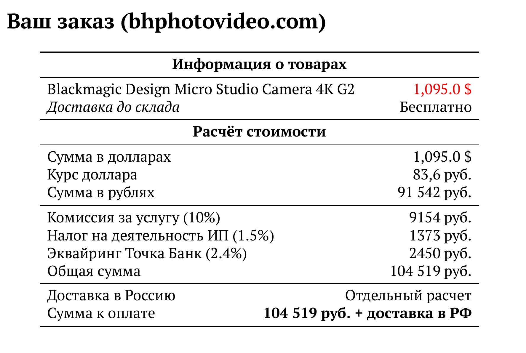 Расчет для bhphotovideo.com — 104 519 руб.