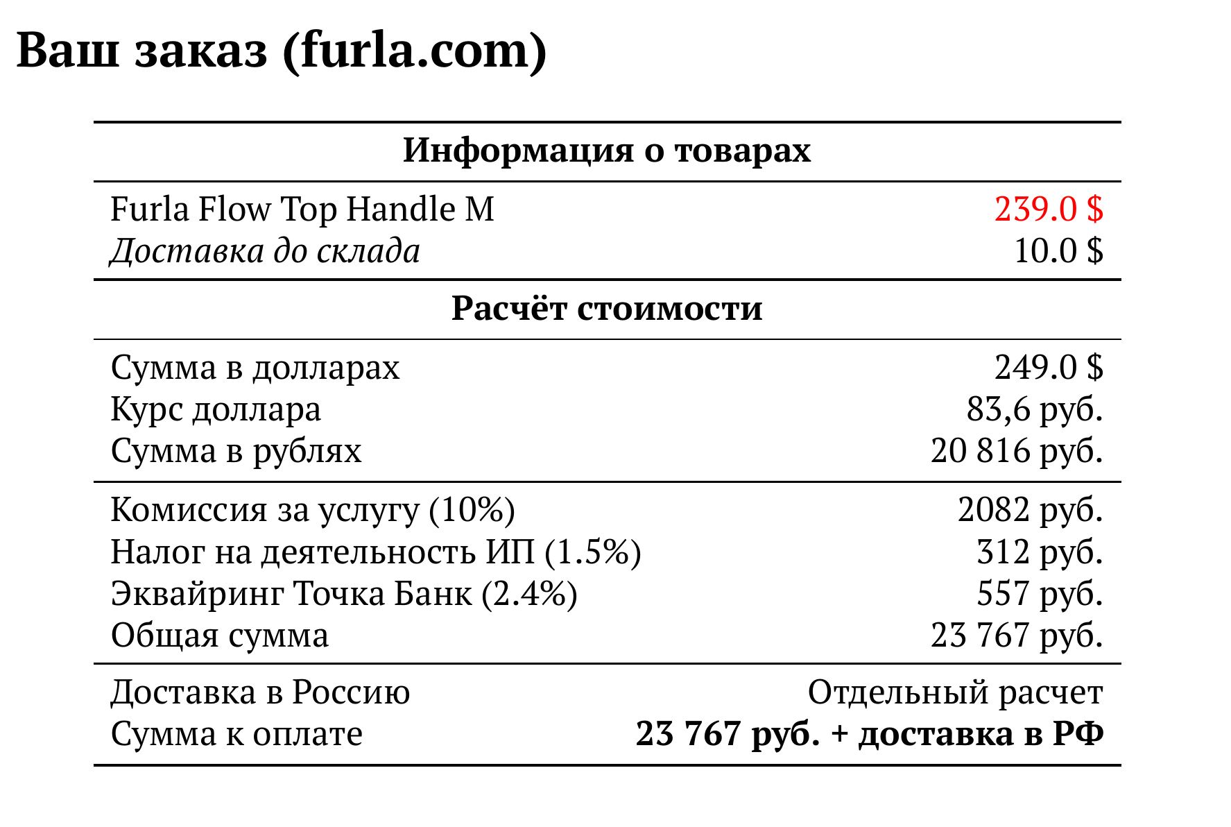 Расчет для furla.com — 23 767 руб.