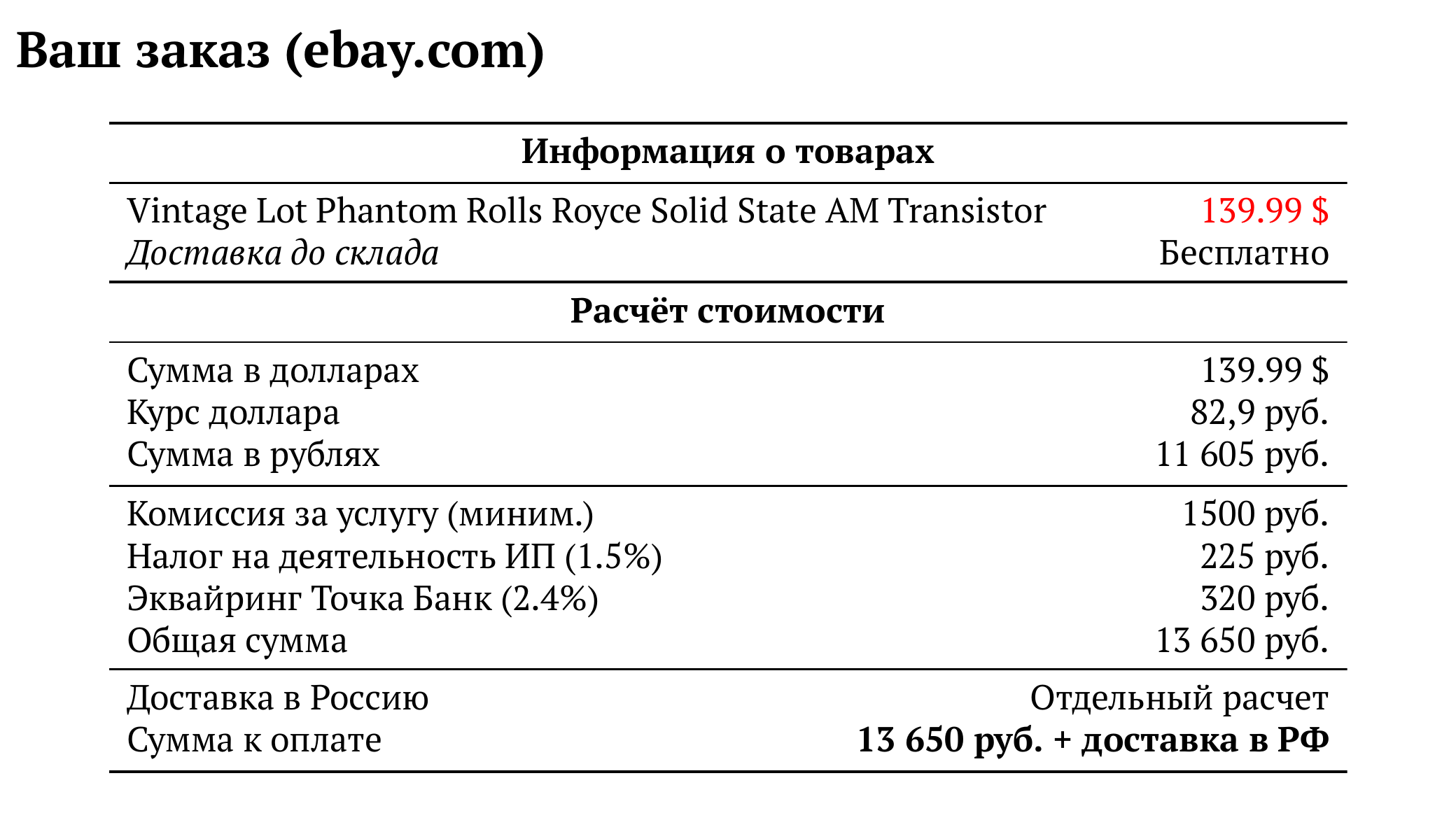 Расчет для ebay.com — 13 650 руб.
