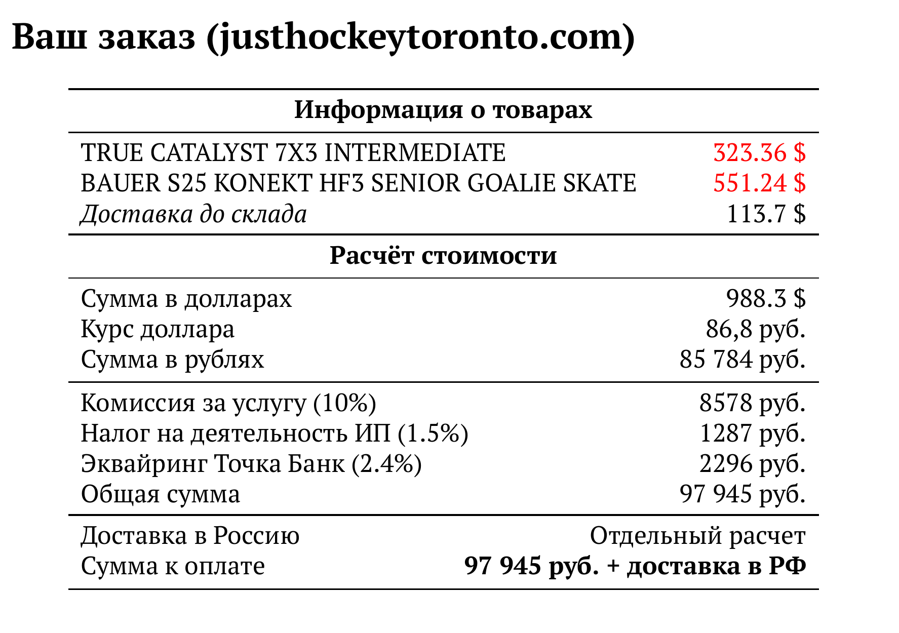 Расчет для justhockeytoronto.com — 97 945 руб.