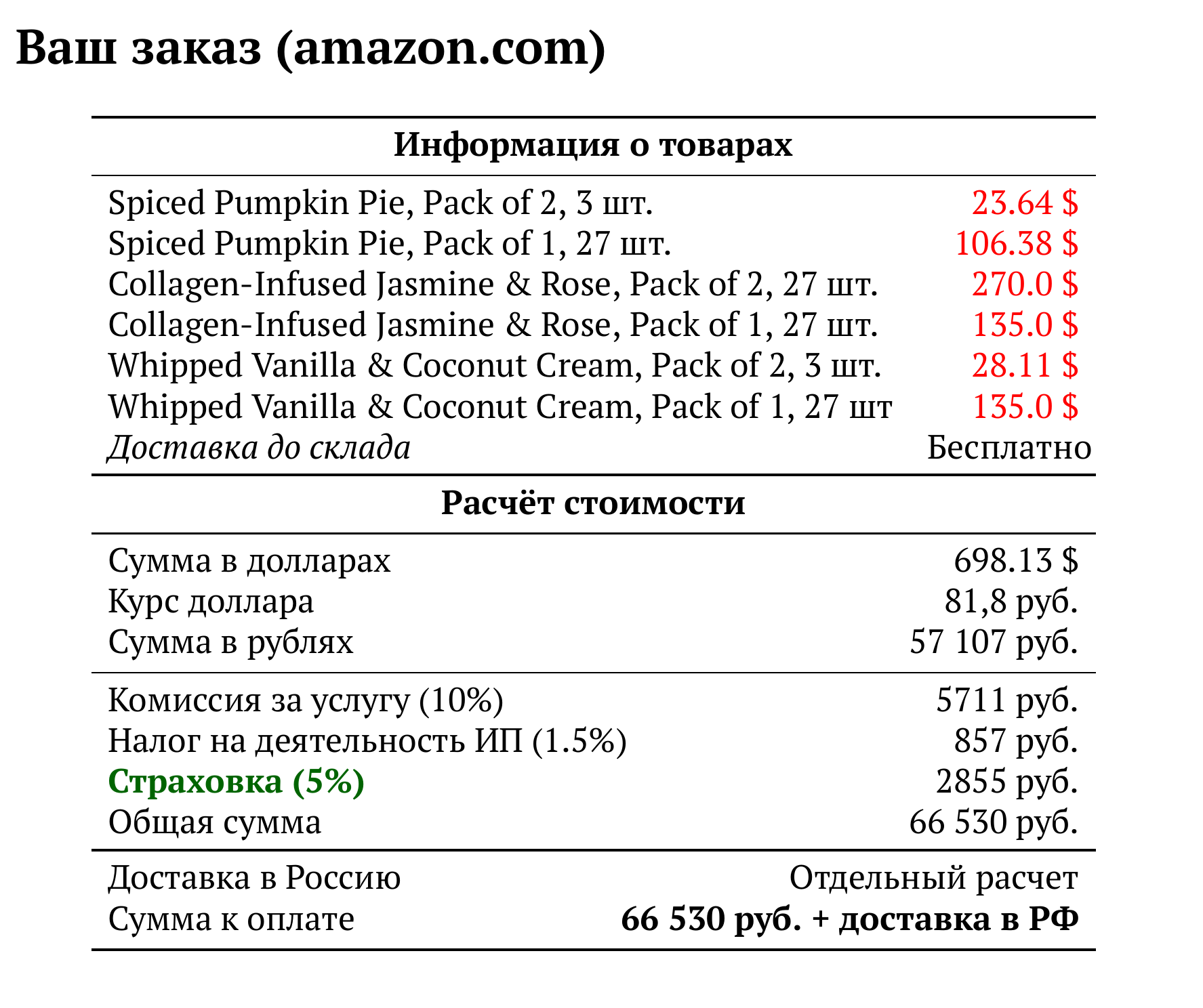 Расчет для amazon.com — 66 530 руб.