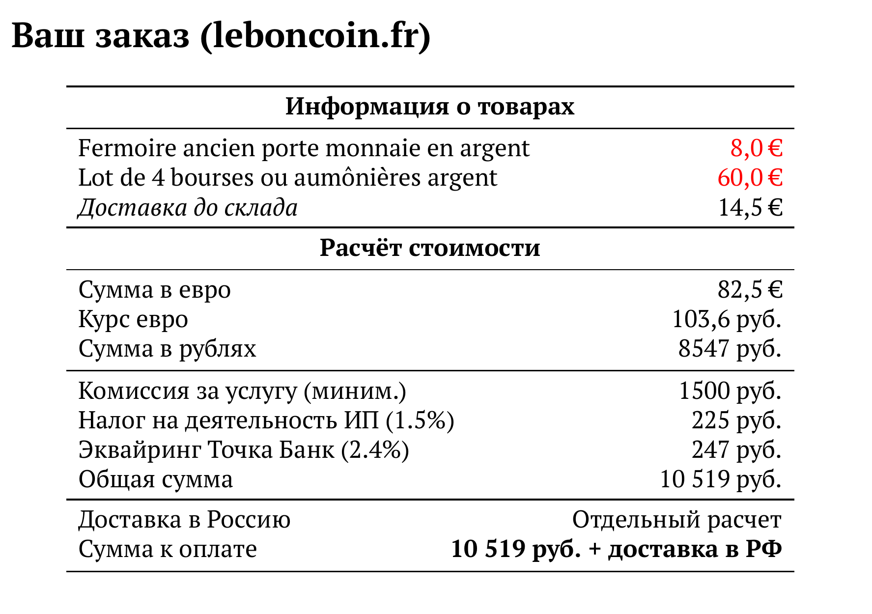 Расчет для leboncoin.fr — 10 519 руб.