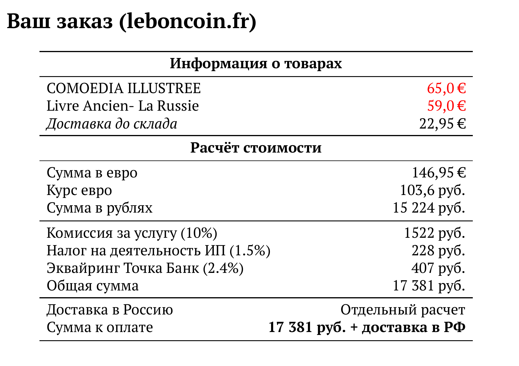Расчет для leboncoin.fr — 17 381 руб.