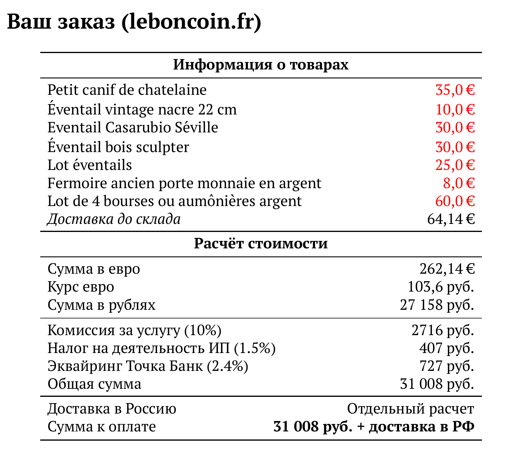 Расчет для leboncoin.fr — 31 008 руб.
