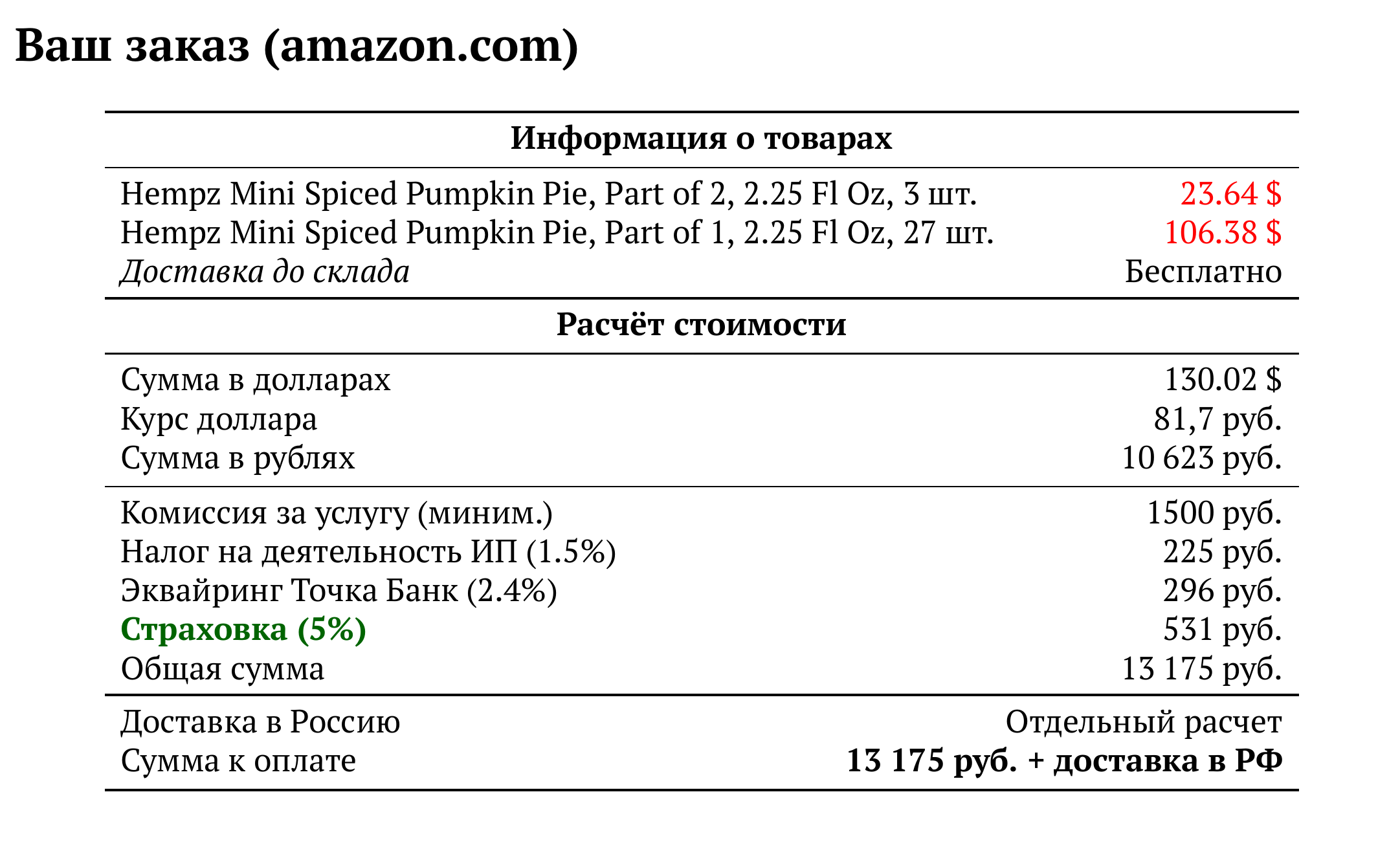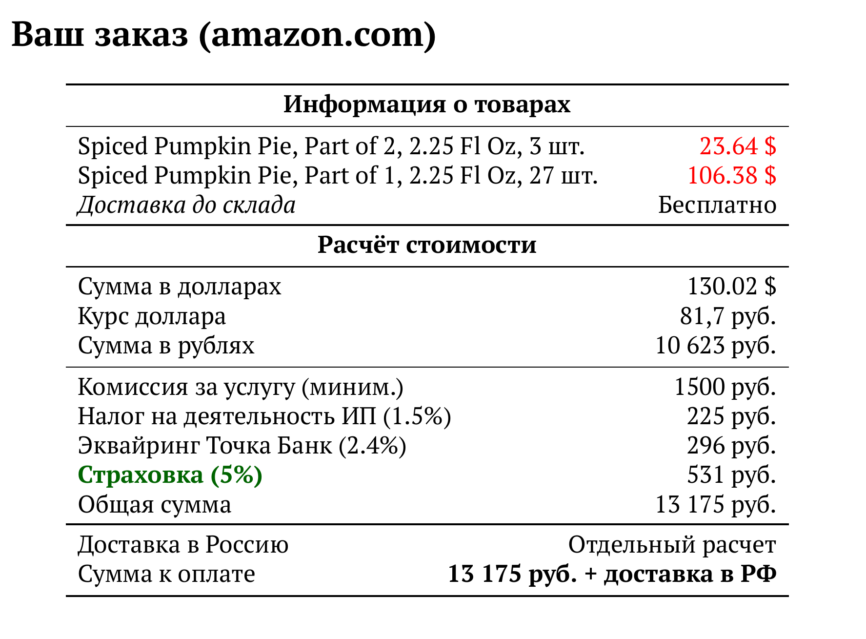 Расчет для amazon.com — 13 175 руб.
