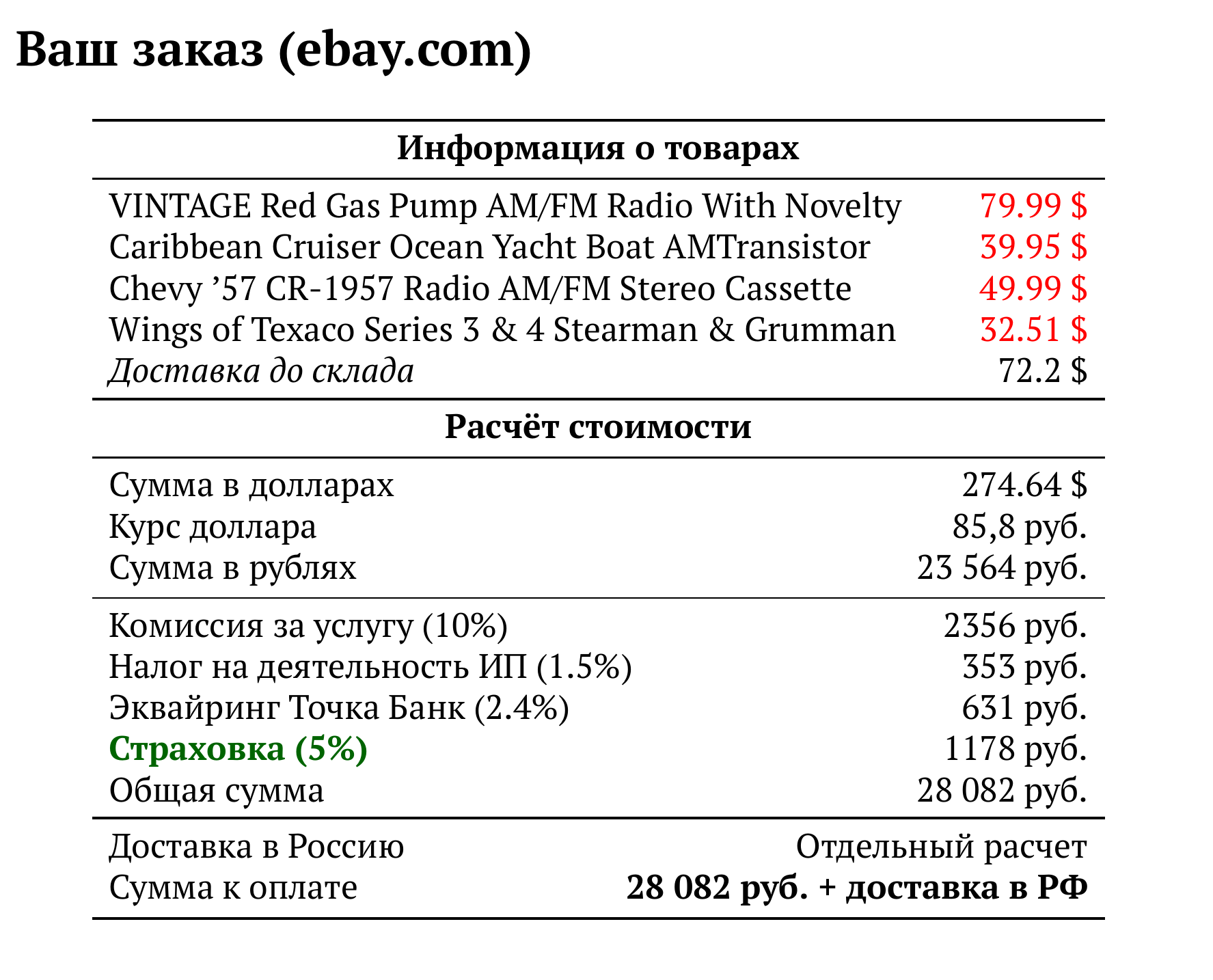 Расчет для ebay.com — 28 082 руб.