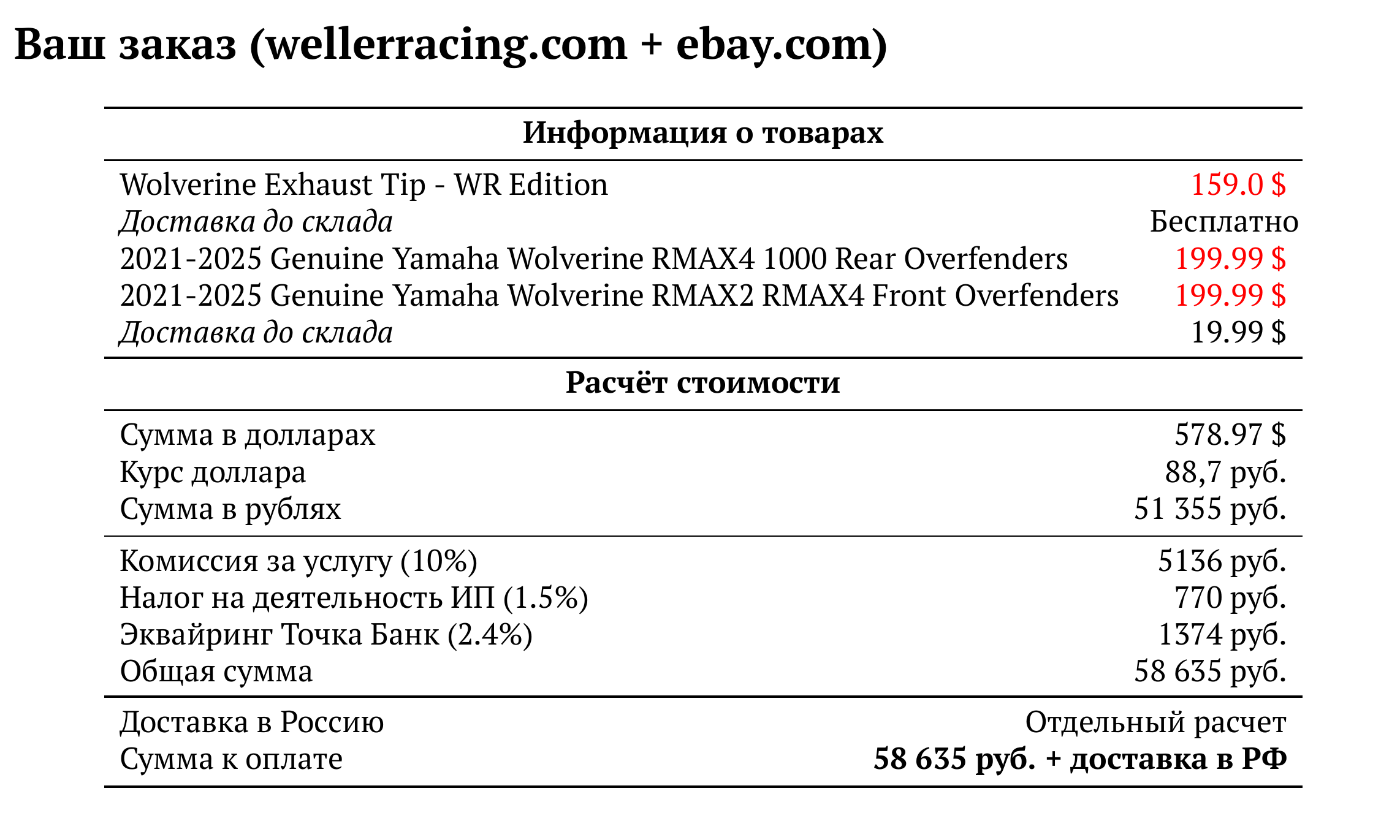 Расчет для wellerracing.com + ebay.com — 58 635 руб.