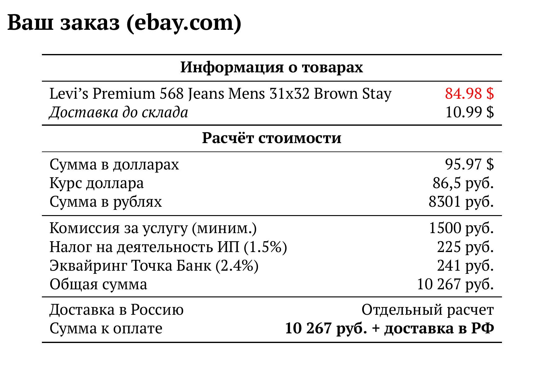 Расчет для ebay.com — 10 267 руб.