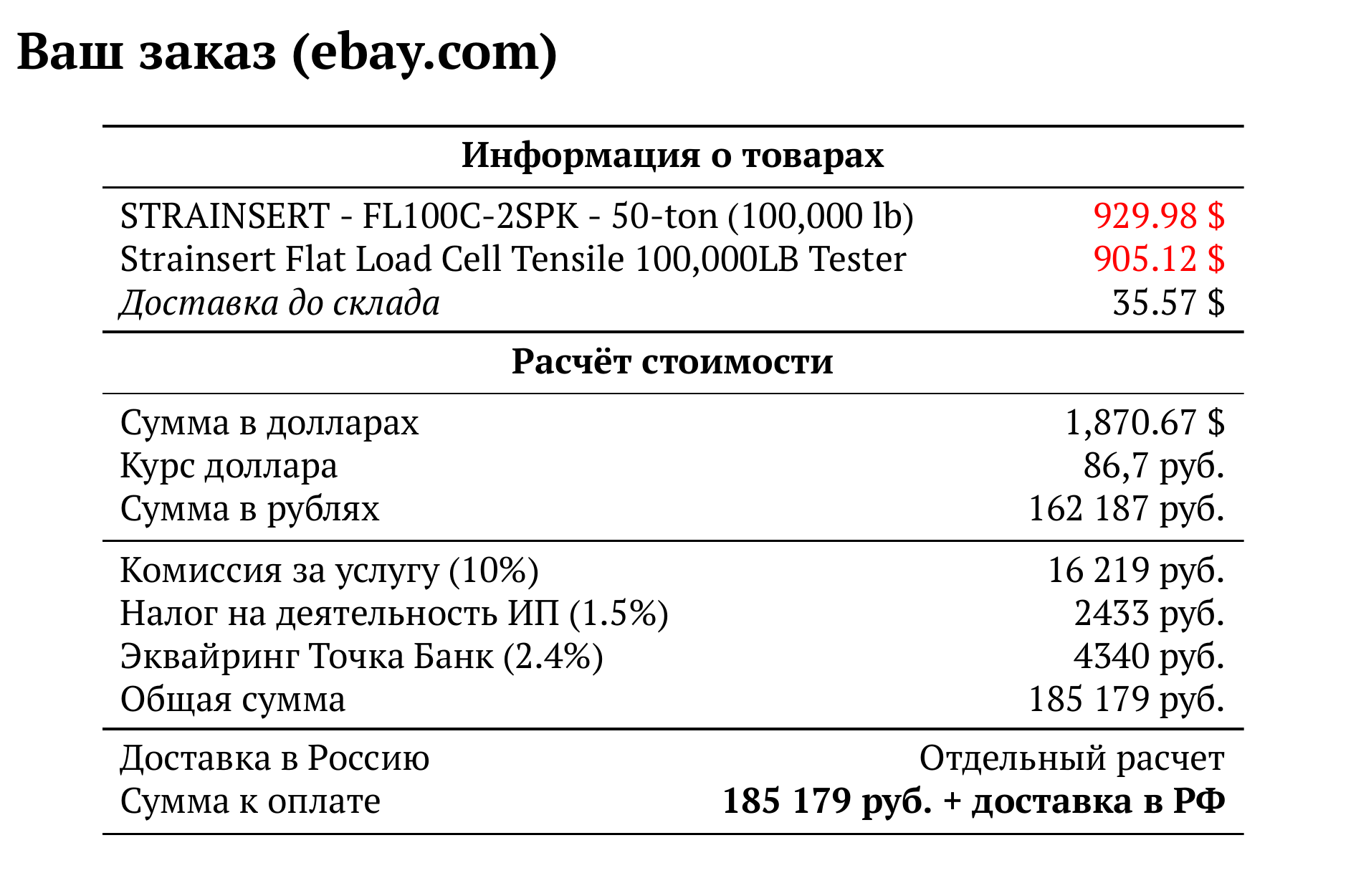 Расчет для ebay.com — 185 605 руб.