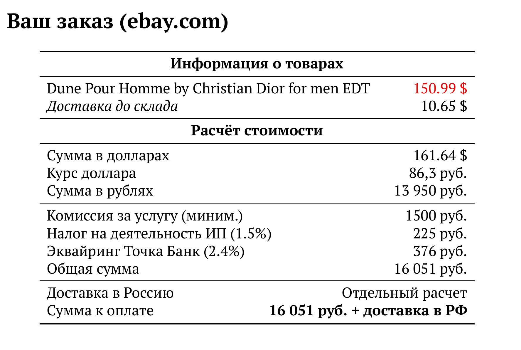 Расчет для ebay.com — 16 051 руб.