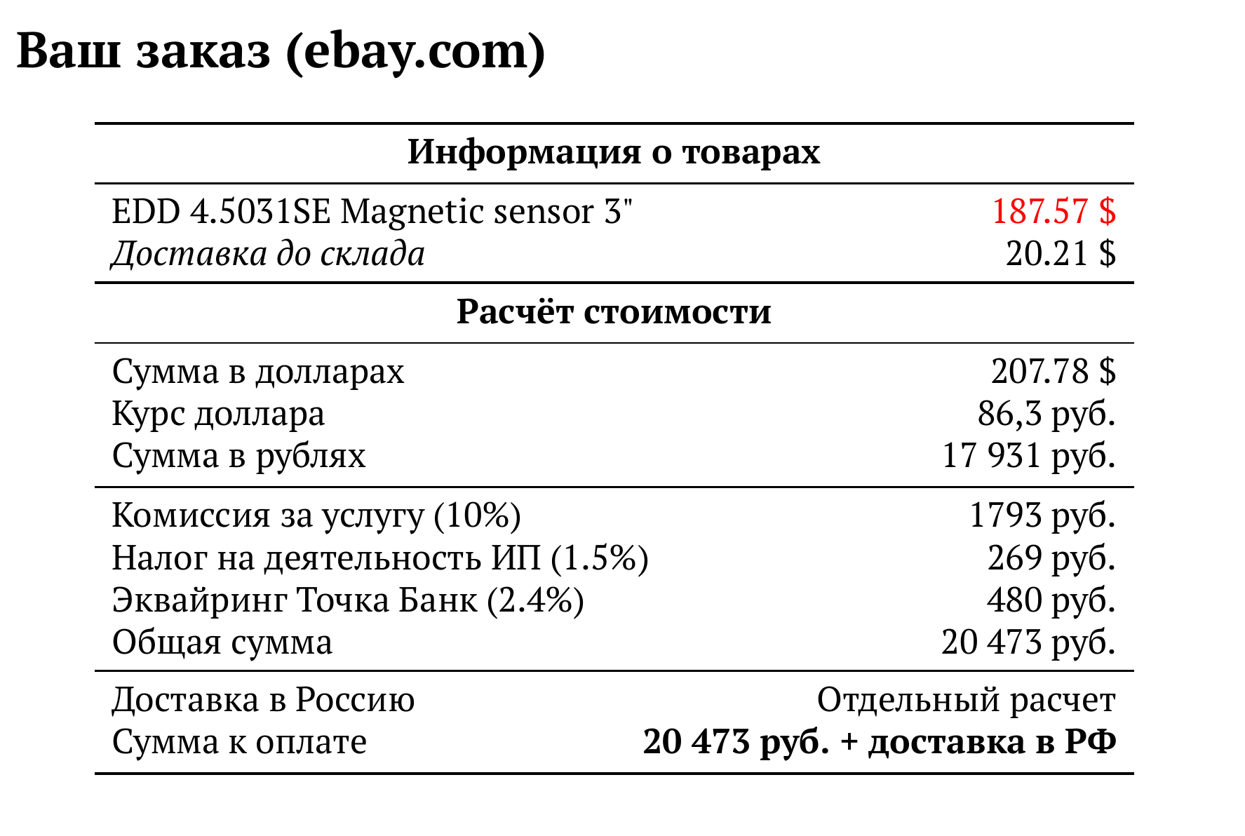 Расчет для ebay.com — 20 473 руб.