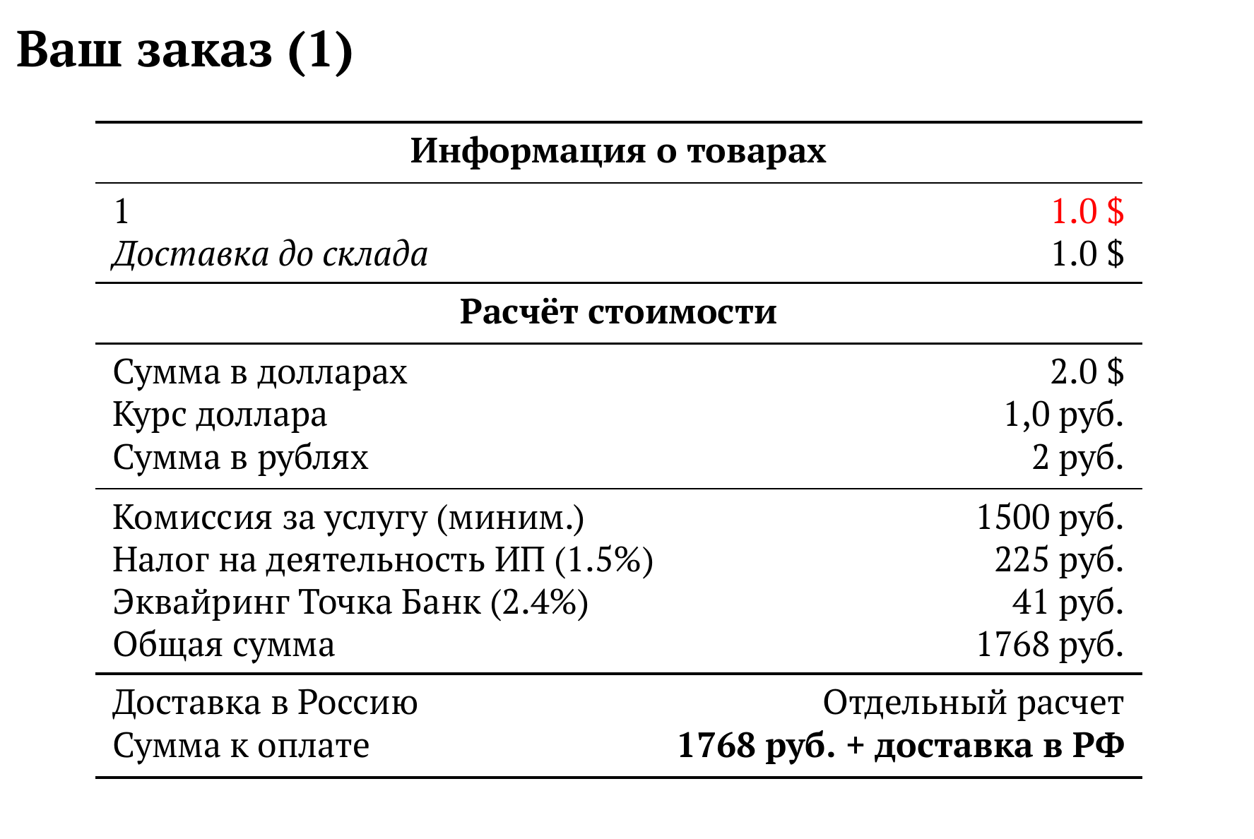 Расчет для 1 — 1768 руб.