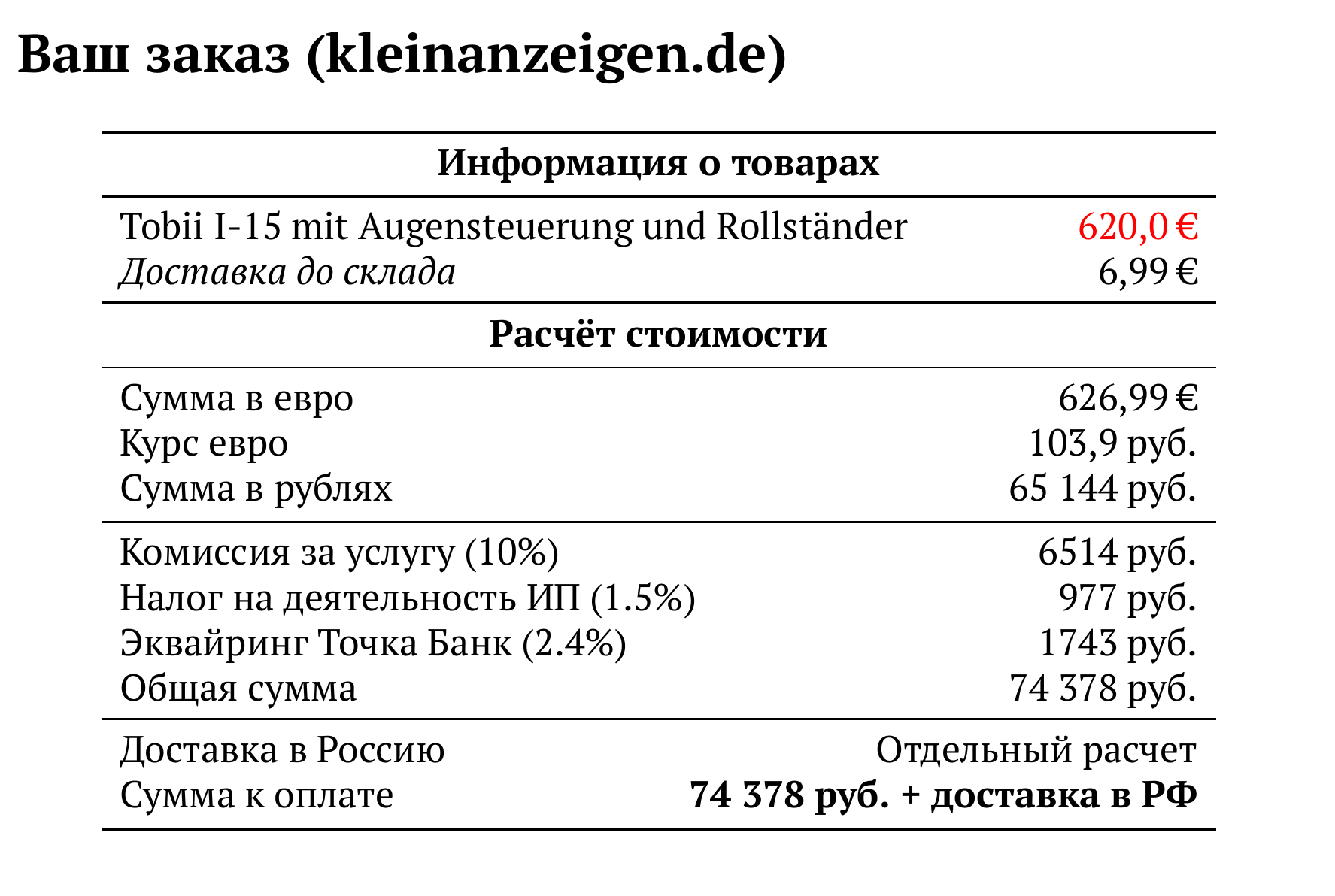 Расчет для kleinanzeigen.de — 74 378 руб.