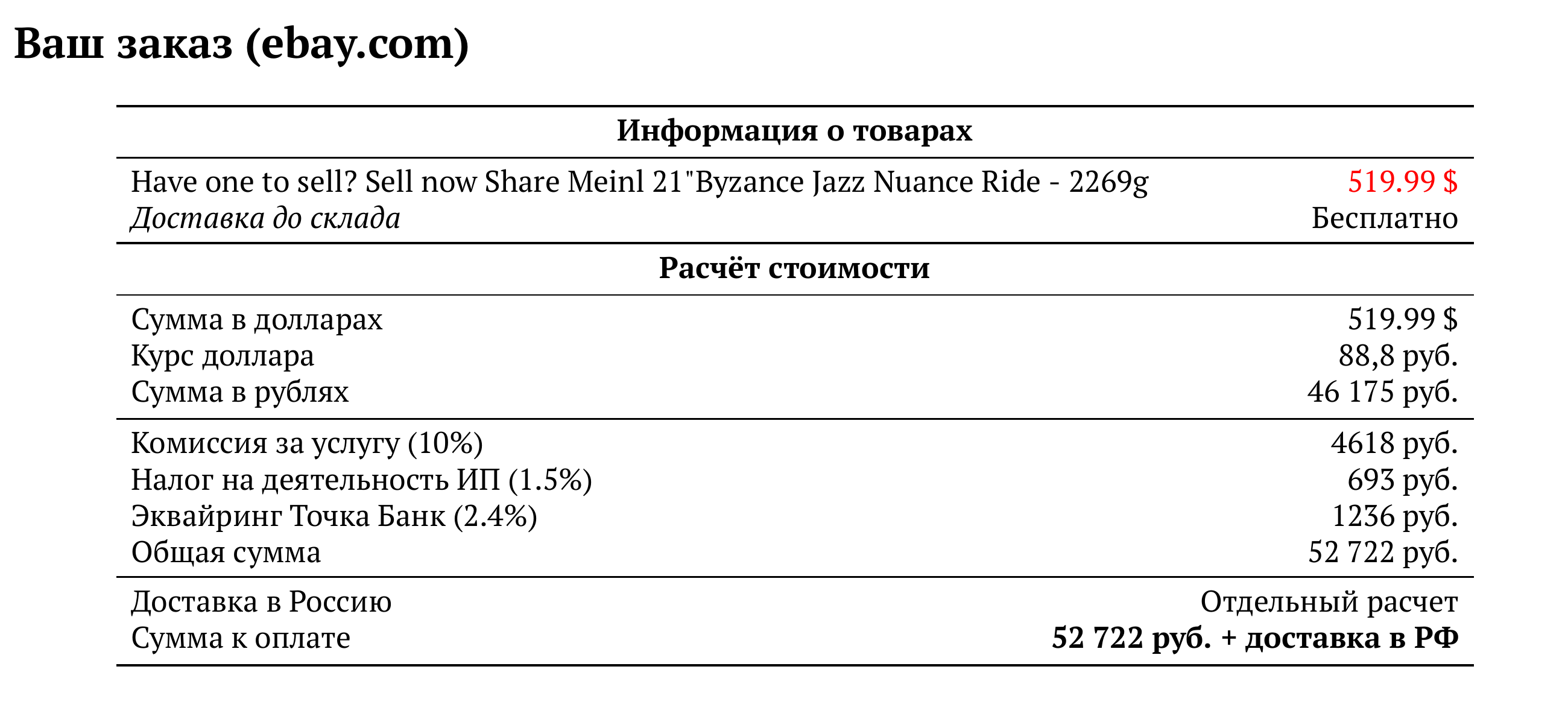 Расчет для ebay.com — 52 722 руб.