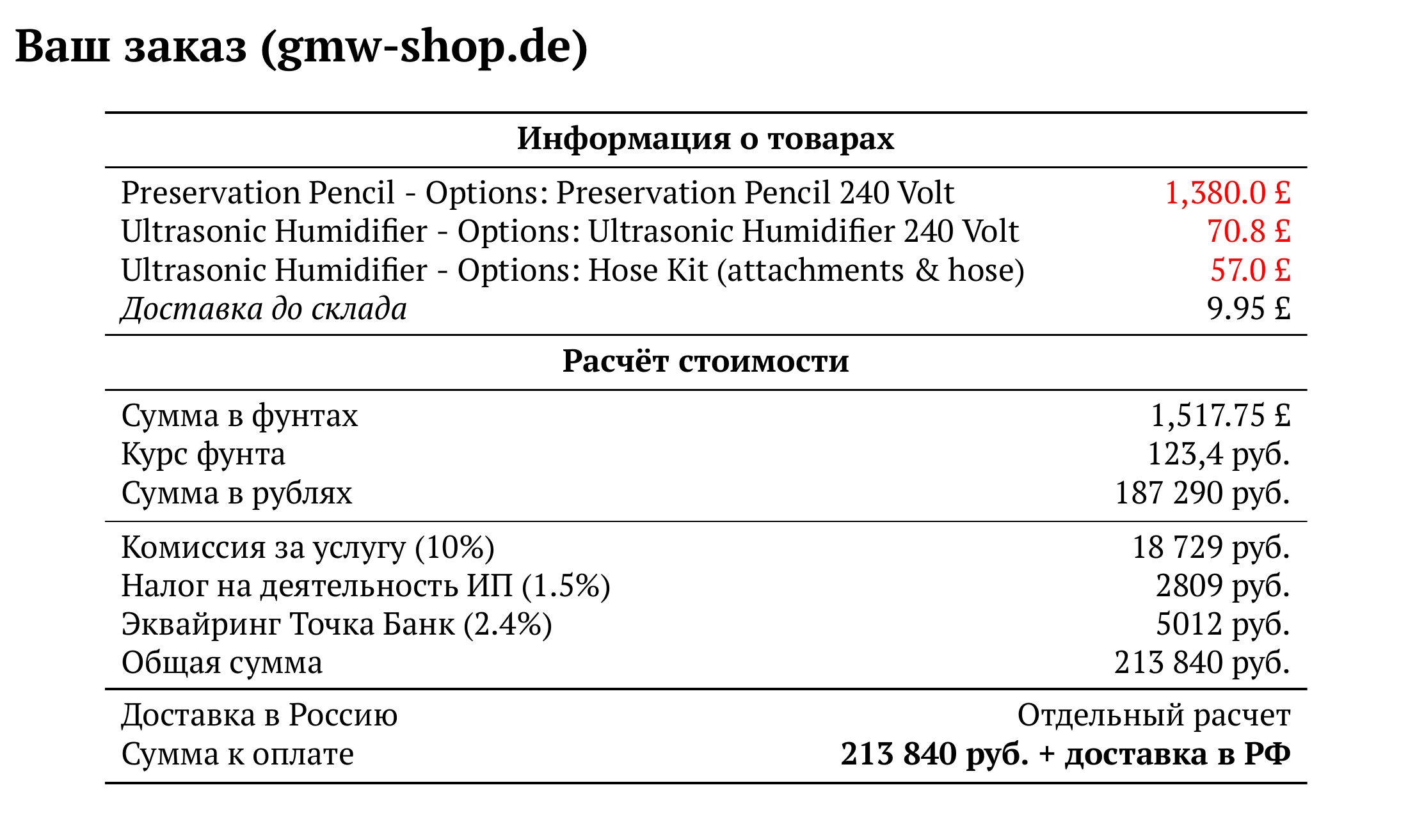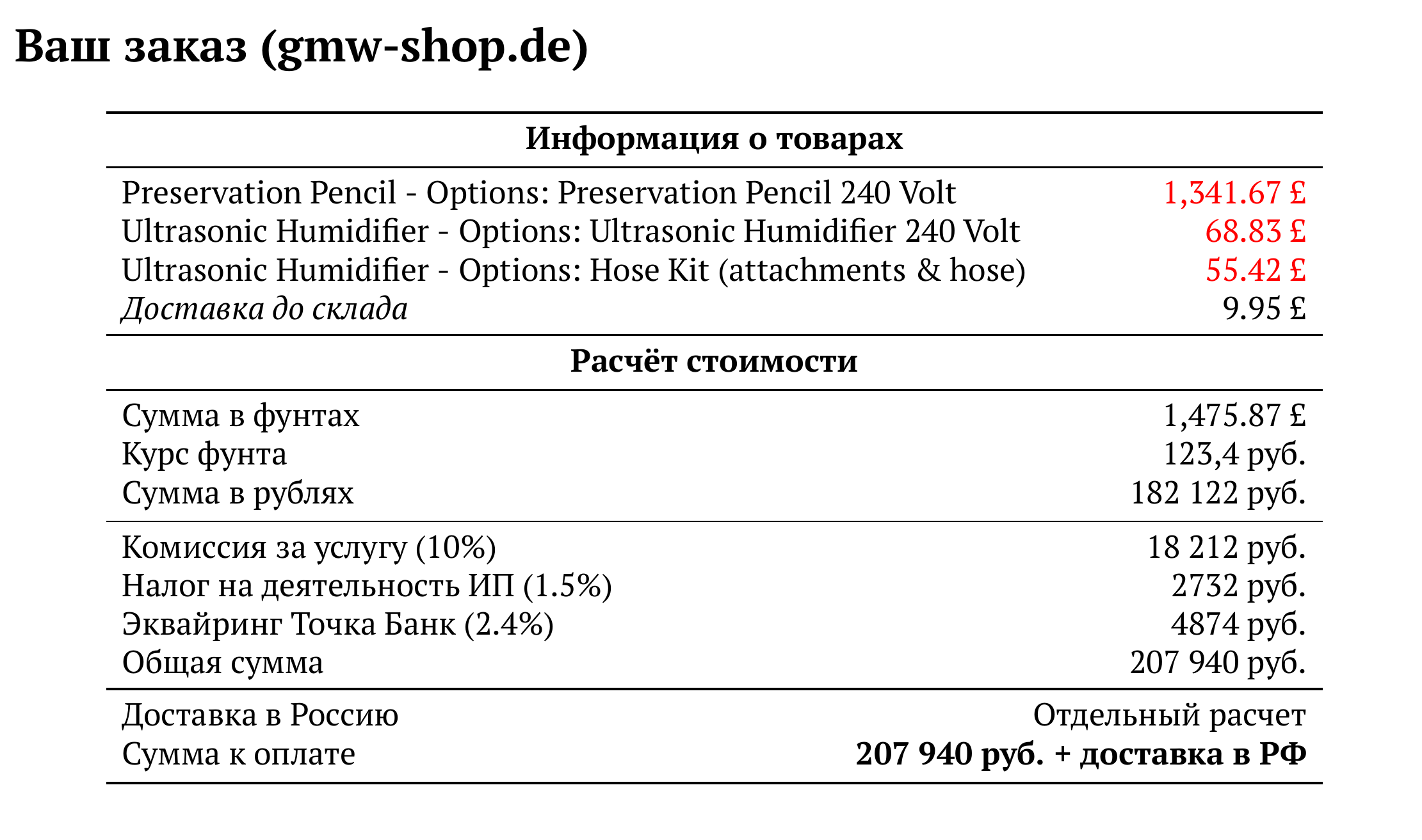 Расчет для gmw-shop.de — 207 940 руб.