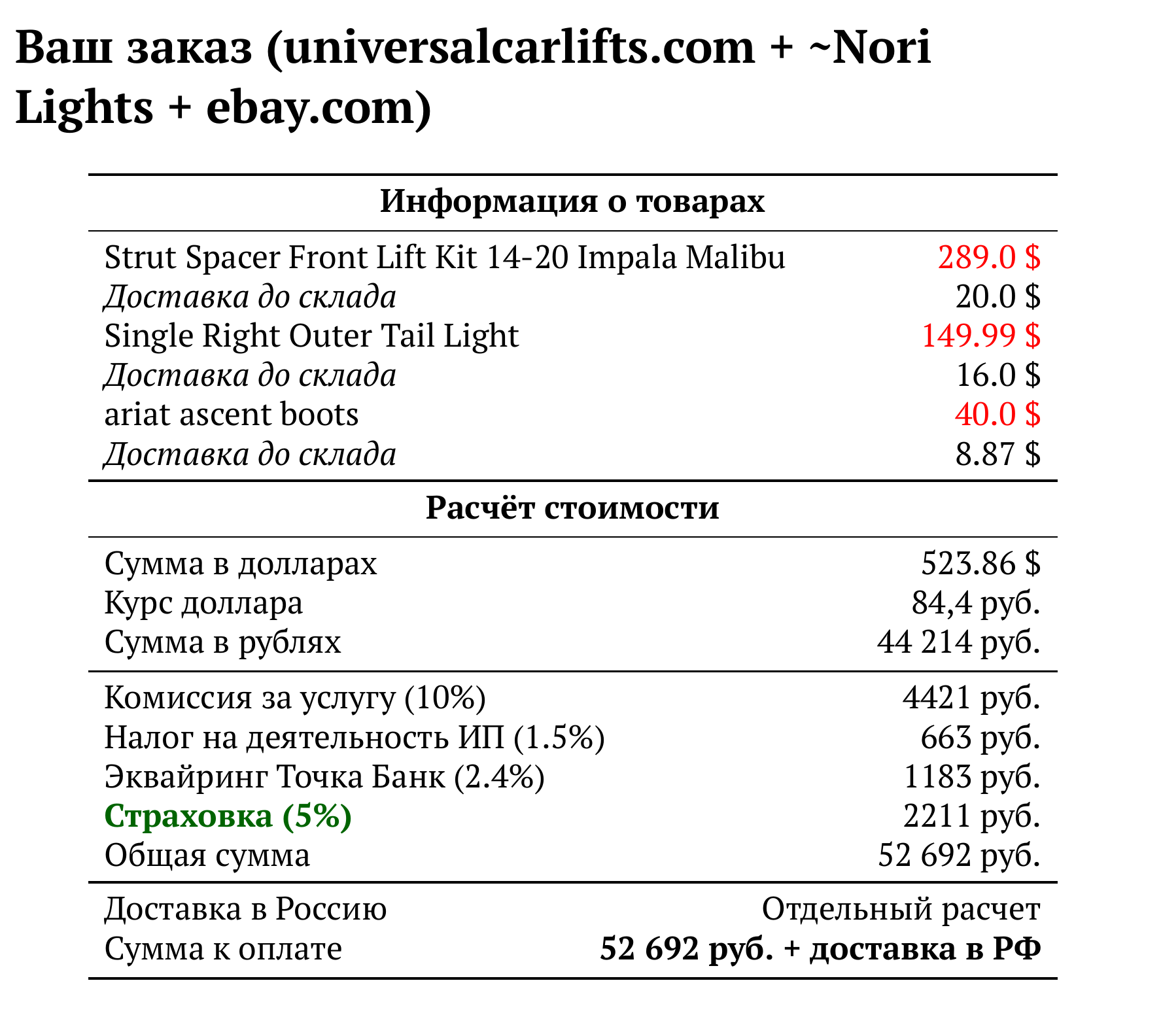 Расчет для universalcarlifts.com + ~Nori Lights + ebay.com — 52 692 руб.