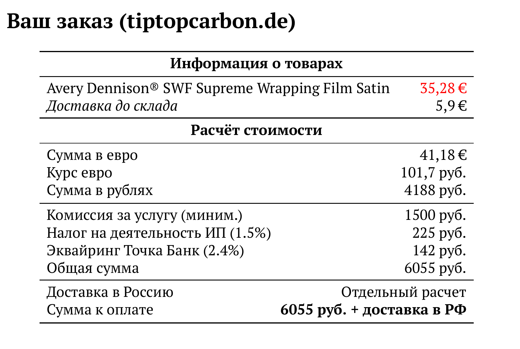 Расчет для tiptopcarbon.de — 6055 руб.