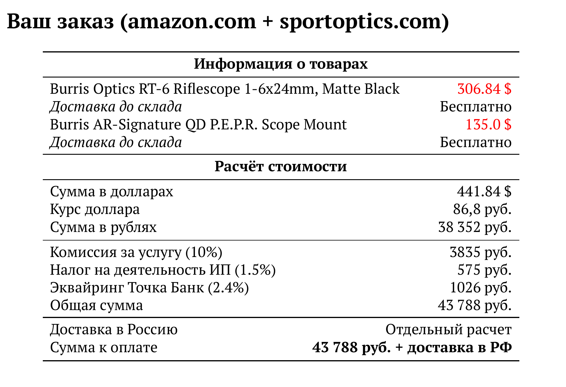 Расчет для amazon.com + sportoptics.com — 43 788 руб.