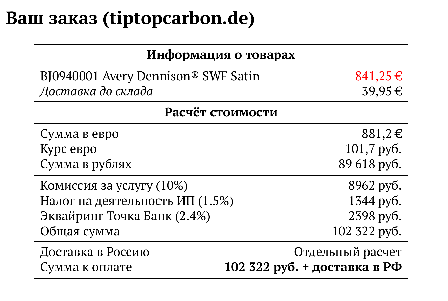 Расчет для tiptopcarbon.de — 102 322 руб.