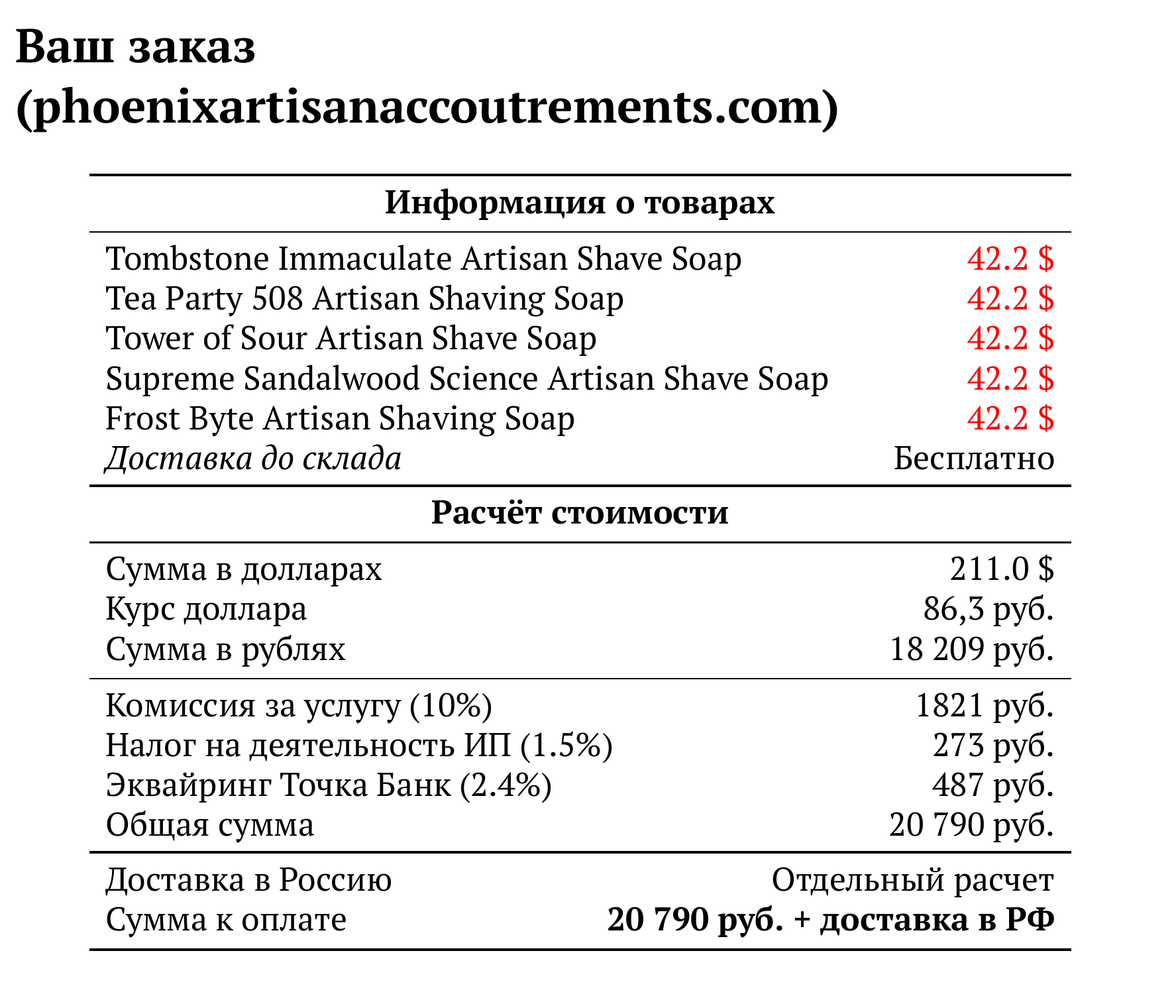 Расчет для phoenixartisanaccoutrements.com — 20 790 руб.