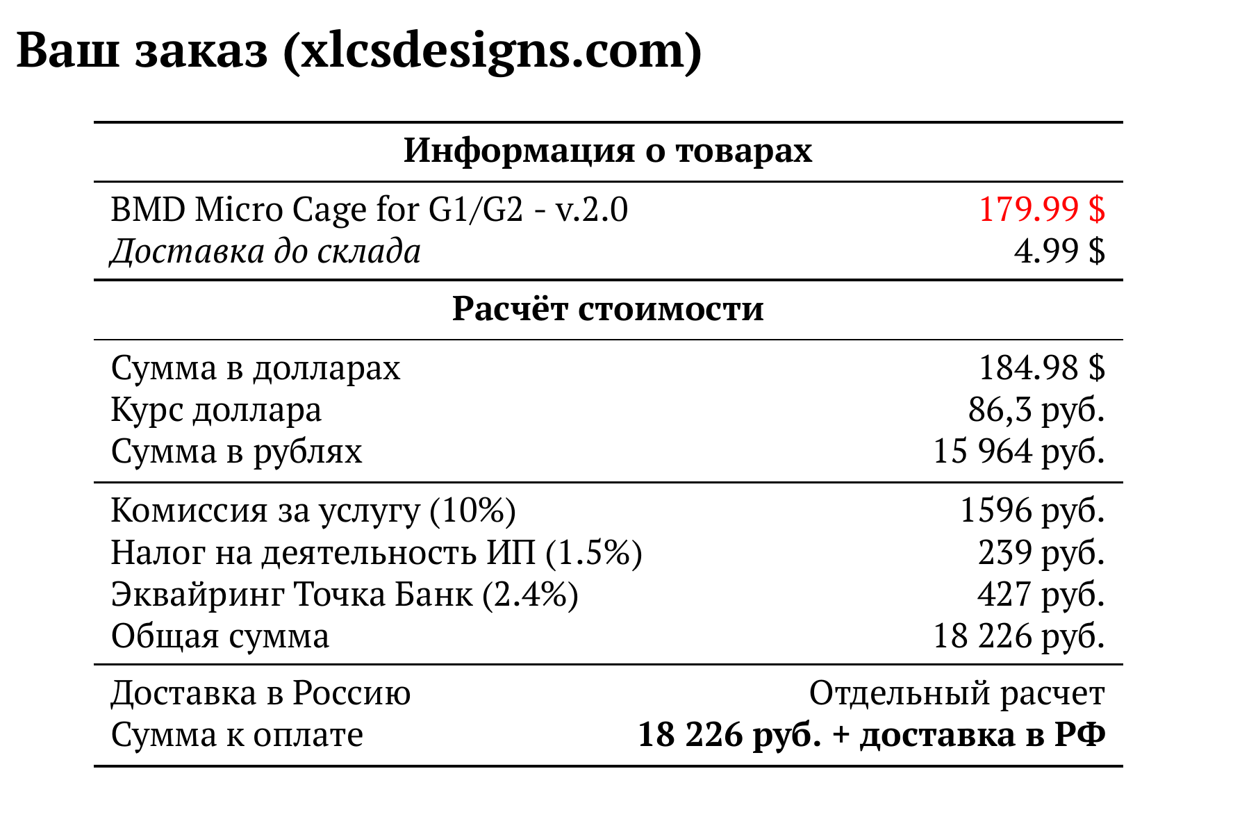 Расчет для xlcsdesigns.com — 18 226 руб.