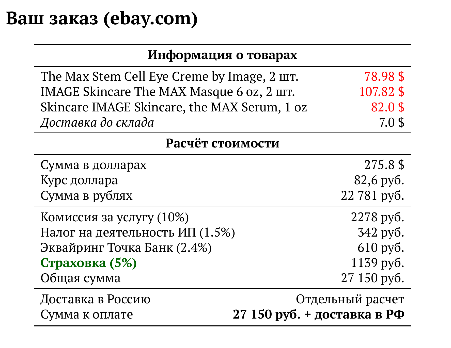Расчет для ebay.com — 27 150 руб.