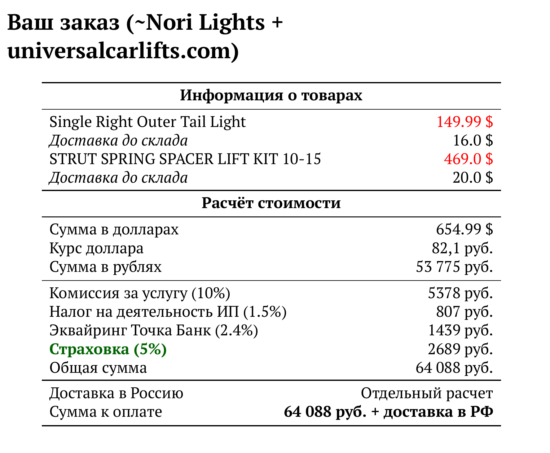 Расчет для ~Nori Lights + universalcarlifts.com — 64 088 руб.
