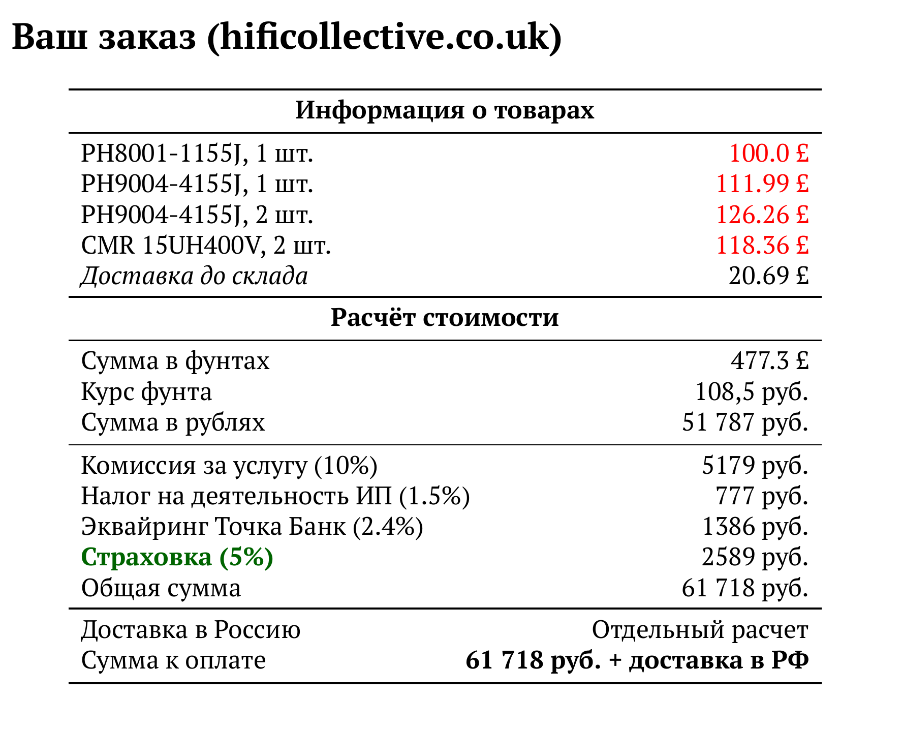 Расчет для hificollective.co.uk — 61 718 руб.