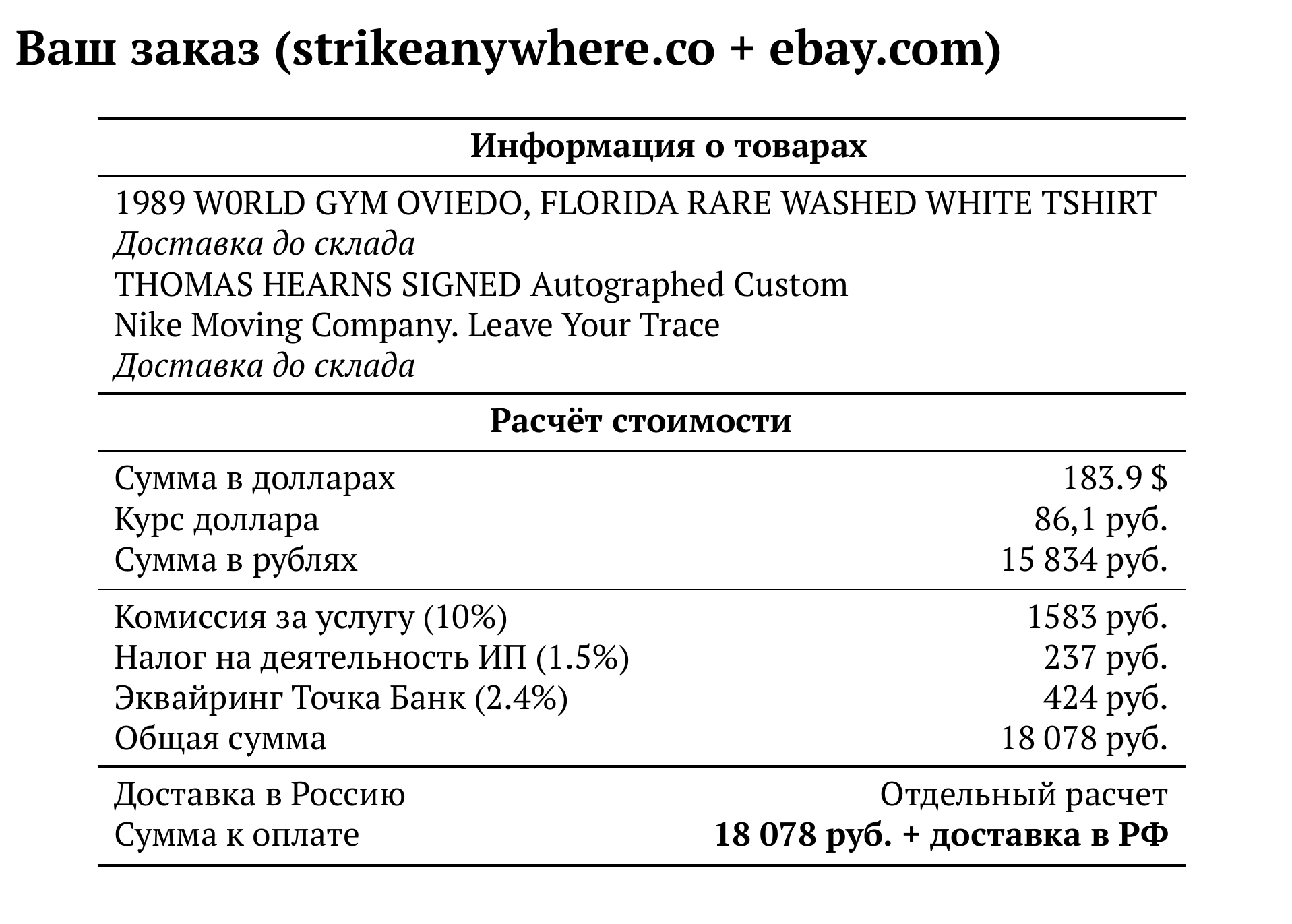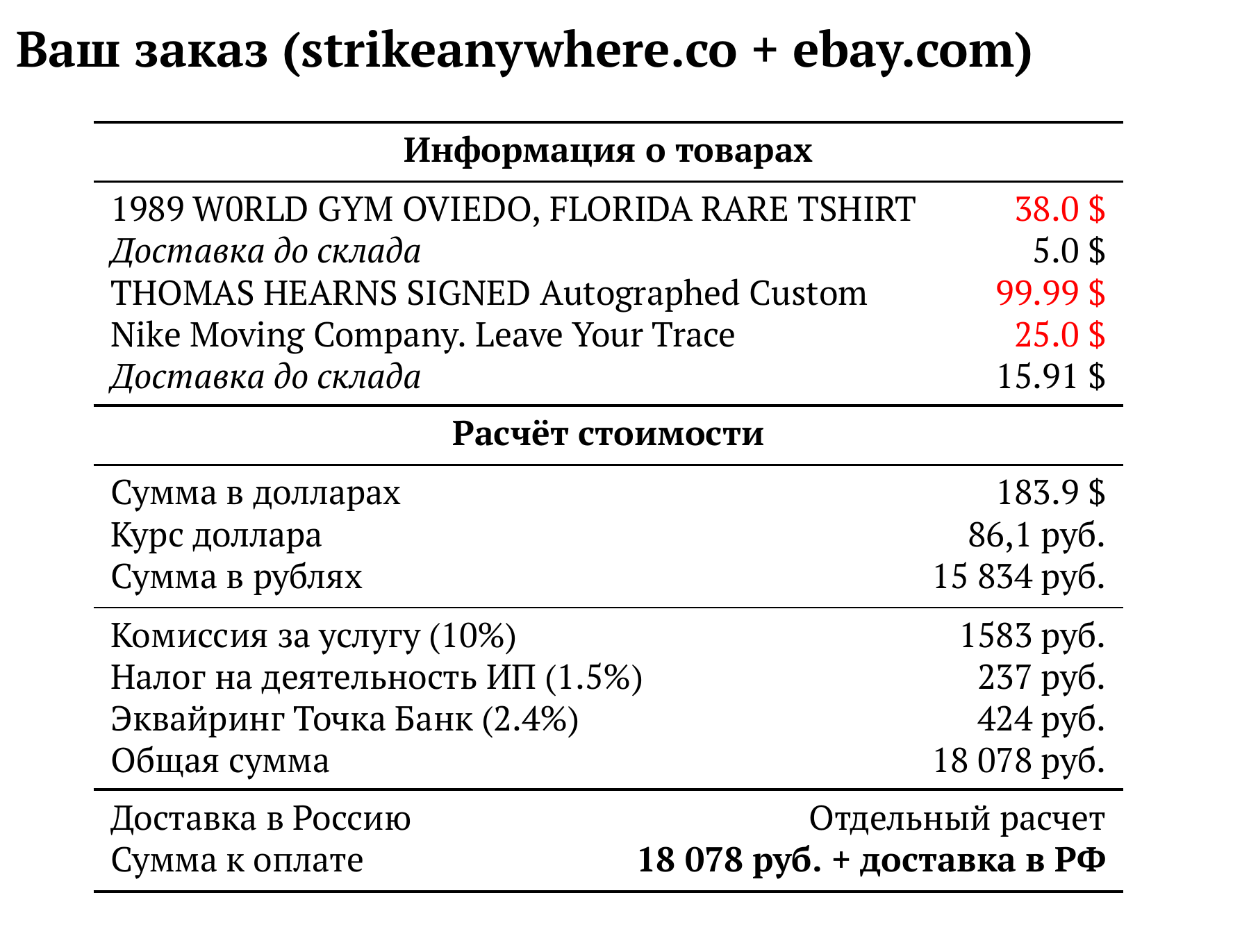 Расчет для strikeanywhere.co + ebay.com — 18 078 руб.